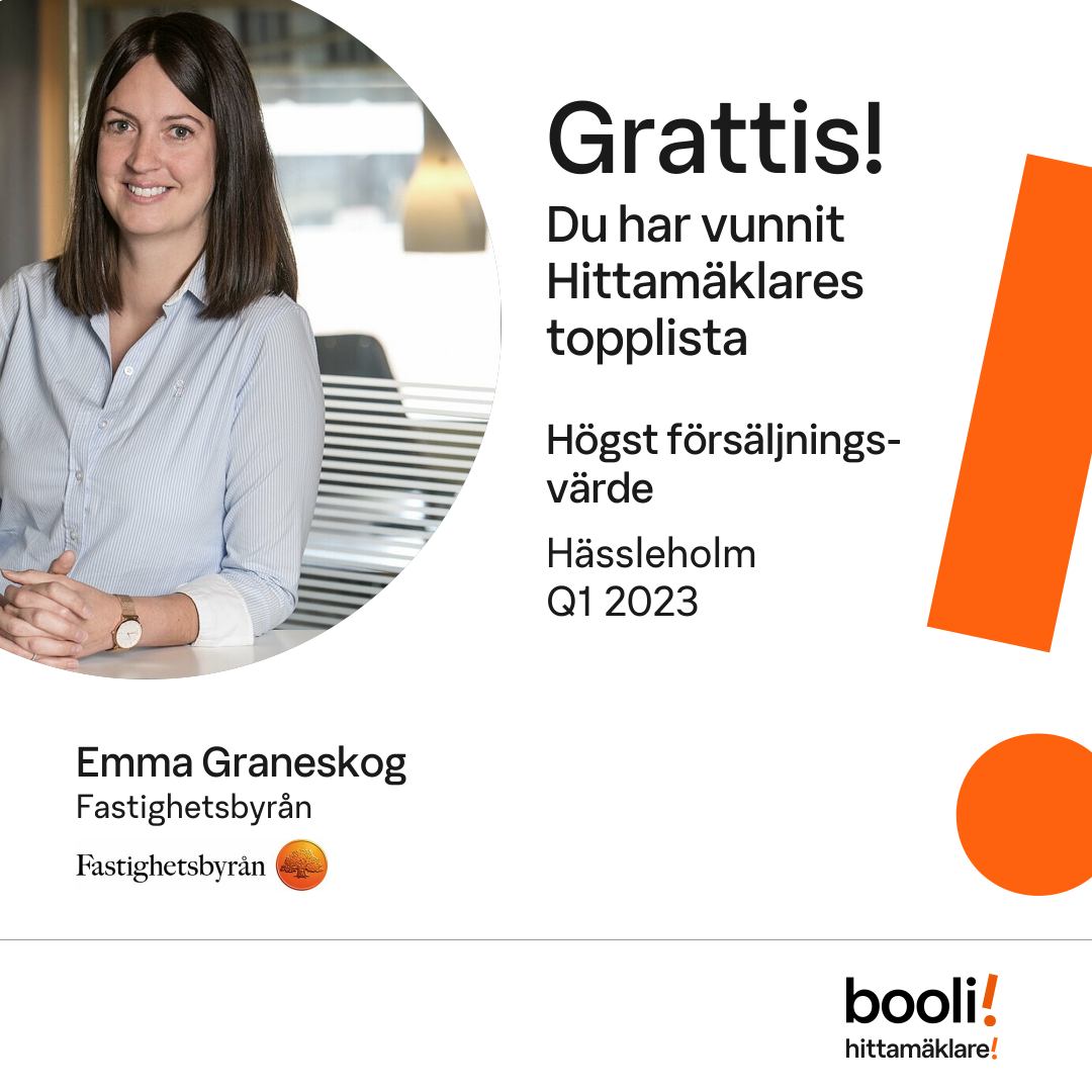 Statistik för publicerade bostäder, försäljningar och omdömen baseras på data från Booli och Hittamäklare. Statistiken för försäljningar avser inrapporterade och verifierade slutpriser från mäklare eller av Booli inhämtade och verifierade slutpriser. Statistiken för publicerade bostäder baseras på information som publicerats på Booli.se. Statistik för omdömen och rekommendationer baseras på omdömen från säljare som lämnats via Booli och Hittamäklare.