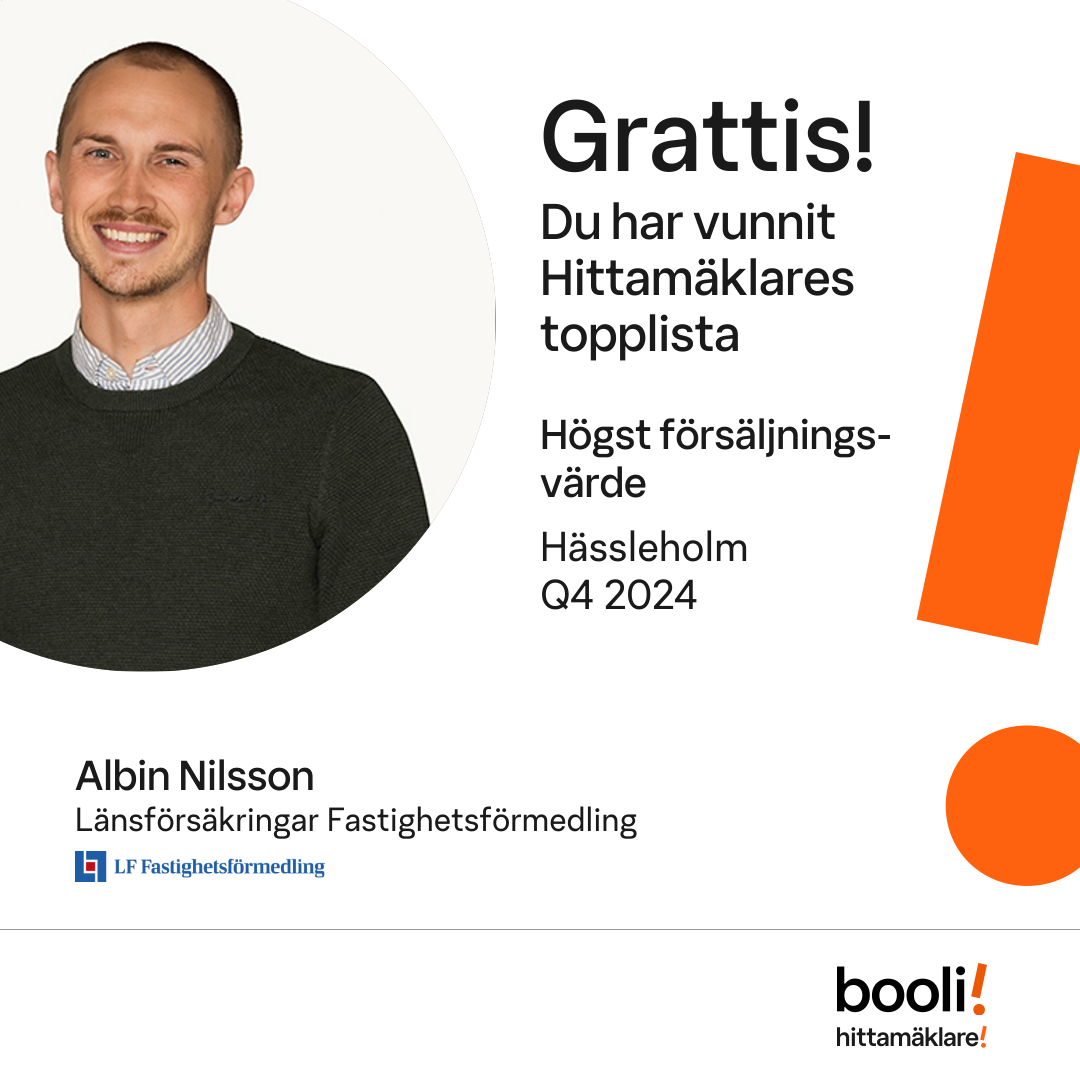 Statistik för publicerade bostäder, försäljningar och omdömen baseras på data från Booli och Hittamäklare. Statistiken för försäljningar avser inrapporterade och verifierade slutpriser från mäklare eller av Booli inhämtade och verifierade slutpriser. Statistiken för publicerade bostäder baseras på information som publicerats på Booli.se. Statistik för omdömen och rekommendationer baseras på omdömen från säljare som lämnats via Booli och Hittamäklare.