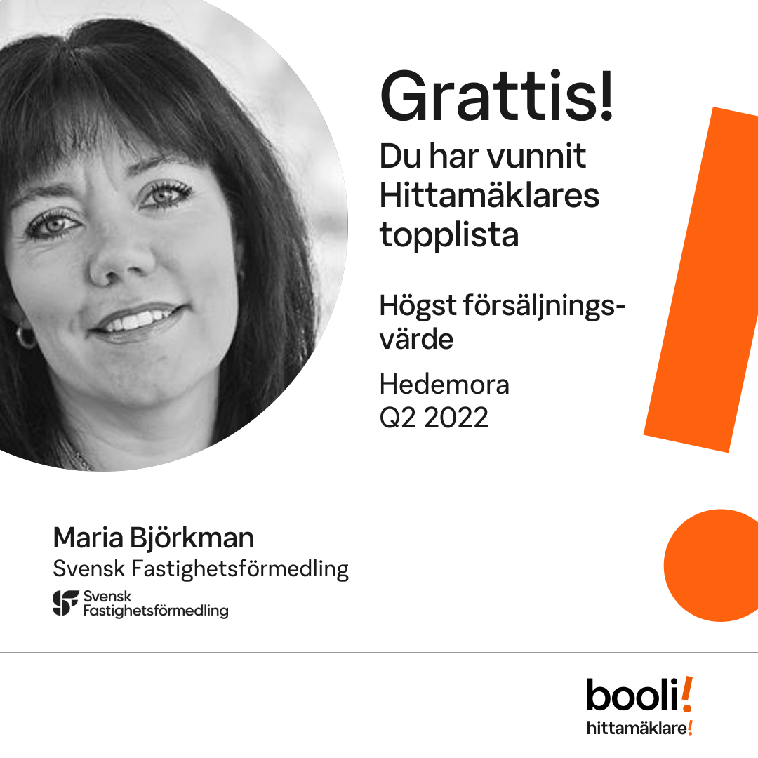 Statistik för publicerade bostäder, försäljningar och omdömen baseras på data från Booli och Hittamäklare. Statistiken för försäljningar avser inrapporterade och verifierade slutpriser från mäklare eller av Booli inhämtade och verifierade slutpriser. Statistiken för publicerade bostäder baseras på information som publicerats på Booli.se. Statistik för omdömen och rekommendationer baseras på omdömen från säljare som lämnats via Booli och Hittamäklare.