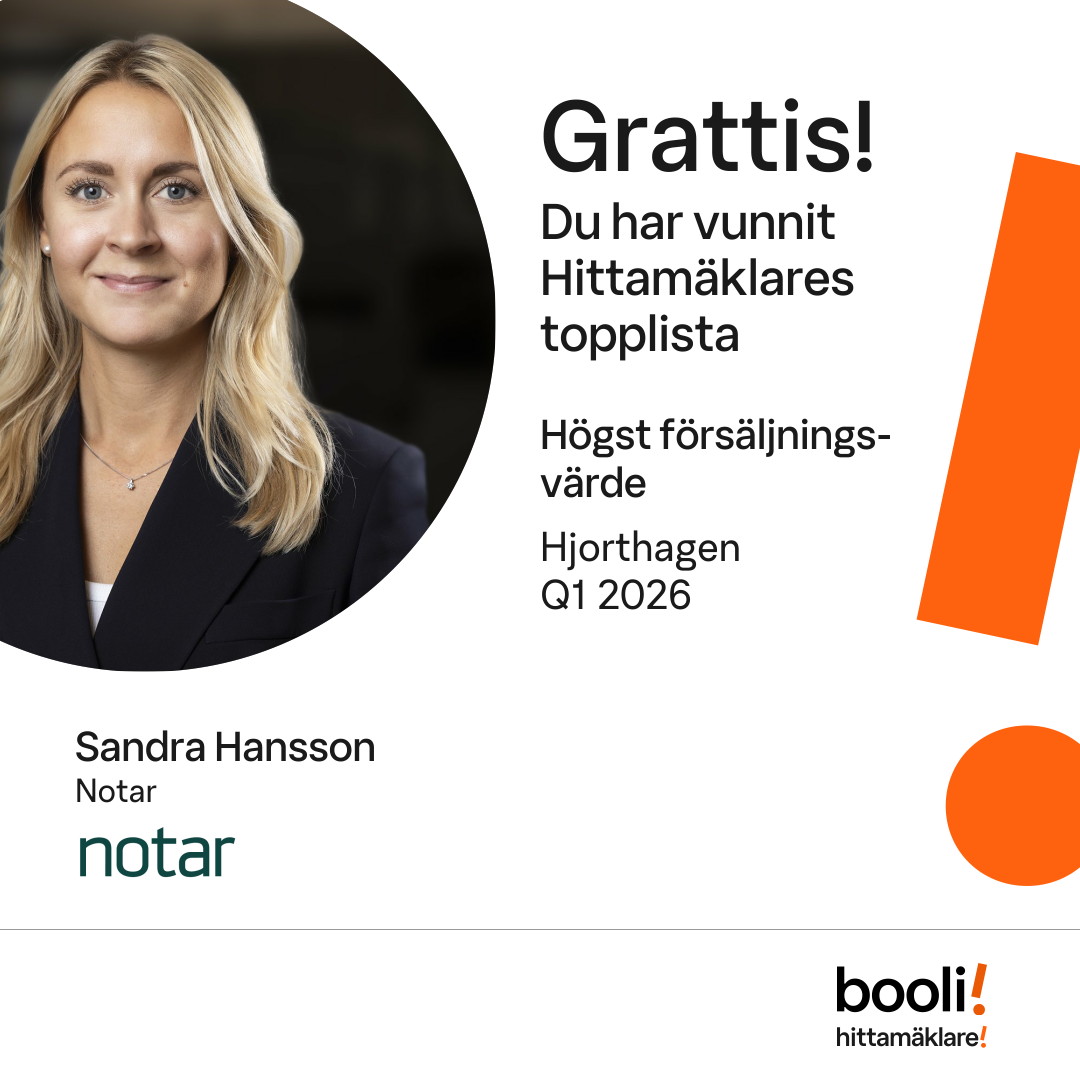Statistik för publicerade bostäder, försäljningar och omdömen baseras på data från Booli och Hittamäklare. Statistiken för försäljningar avser inrapporterade och verifierade slutpriser från mäklare eller av Booli inhämtade och verifierade slutpriser. Statistiken för publicerade bostäder baseras på information som publicerats på Booli.se. Statistik för omdömen och rekommendationer baseras på omdömen från säljare som lämnats via Booli och Hittamäklare.