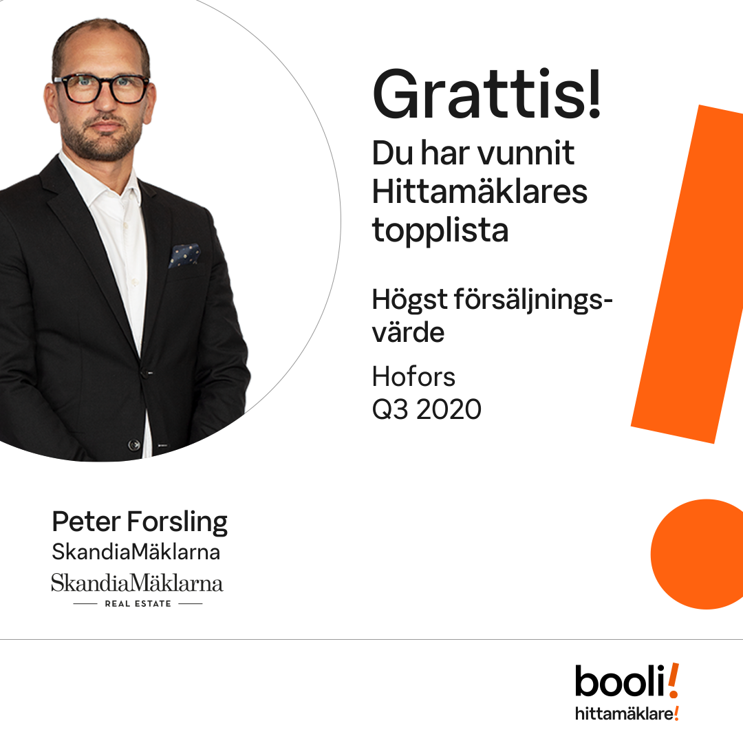 Statistik för publicerade bostäder, försäljningar och omdömen baseras på data från Booli och Hittamäklare. Statistiken för försäljningar avser inrapporterade och verifierade slutpriser från mäklare eller av Booli inhämtade och verifierade slutpriser. Statistiken för publicerade bostäder baseras på information som publicerats på Booli.se. Statistik för omdömen och rekommendationer baseras på omdömen från säljare som lämnats via Booli och Hittamäklare.