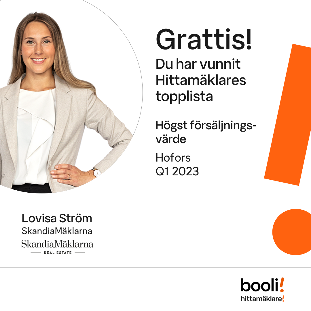 Statistik för publicerade bostäder, försäljningar och omdömen baseras på data från Booli och Hittamäklare. Statistiken för försäljningar avser inrapporterade och verifierade slutpriser från mäklare eller av Booli inhämtade och verifierade slutpriser. Statistiken för publicerade bostäder baseras på information som publicerats på Booli.se. Statistik för omdömen och rekommendationer baseras på omdömen från säljare som lämnats via Booli och Hittamäklare.