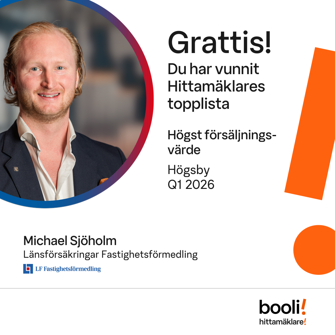 Statistik för publicerade bostäder, försäljningar och omdömen baseras på data från Booli. Statistiken för försäljningar avser inrapporterade och verifierade slutpriser från mäklare eller av Booli inhämtade och verifierade slutpriser. Statistiken för publicerade bostäder baseras på information som publicerats på Booli.se. Statistik för omdömen och rekommendationer baseras på omdömen från säljare som lämnats via Booli.