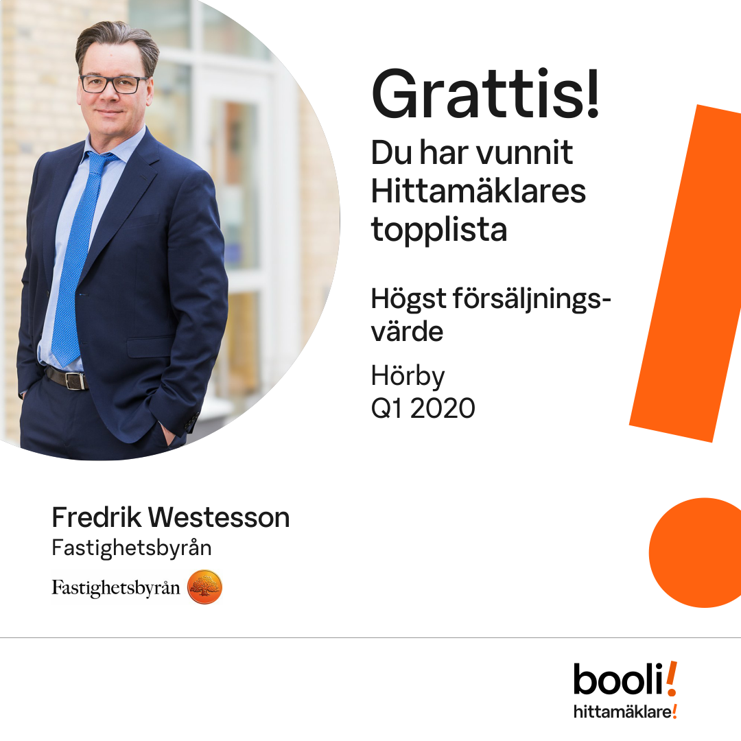 Statistik för publicerade bostäder, försäljningar och omdömen baseras på data från Booli och Hittamäklare. Statistiken för försäljningar avser inrapporterade och verifierade slutpriser från mäklare eller av Booli inhämtade och verifierade slutpriser. Statistiken för publicerade bostäder baseras på information som publicerats på Booli.se. Statistik för omdömen och rekommendationer baseras på omdömen från säljare som lämnats via Booli och Hittamäklare.