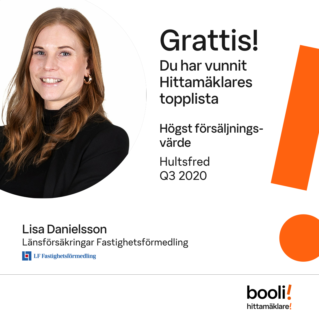 Statistik för publicerade bostäder, försäljningar och omdömen baseras på data från Booli och Hittamäklare. Statistiken för försäljningar avser inrapporterade och verifierade slutpriser från mäklare eller av Booli inhämtade och verifierade slutpriser. Statistiken för publicerade bostäder baseras på information som publicerats på Booli.se. Statistik för omdömen och rekommendationer baseras på omdömen från säljare som lämnats via Booli och Hittamäklare.