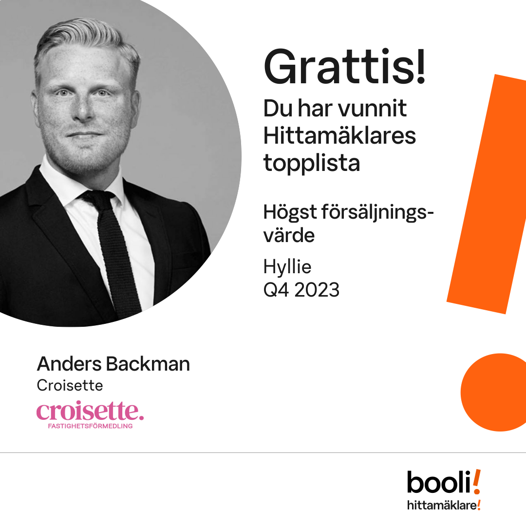 Statistik för publicerade bostäder, försäljningar och omdömen baseras på data från Booli och Hittamäklare. Statistiken för försäljningar avser inrapporterade och verifierade slutpriser från mäklare eller av Booli inhämtade och verifierade slutpriser. Statistiken för publicerade bostäder baseras på information som publicerats på Booli.se. Statistik för omdömen och rekommendationer baseras på omdömen från säljare som lämnats via Booli och Hittamäklare.