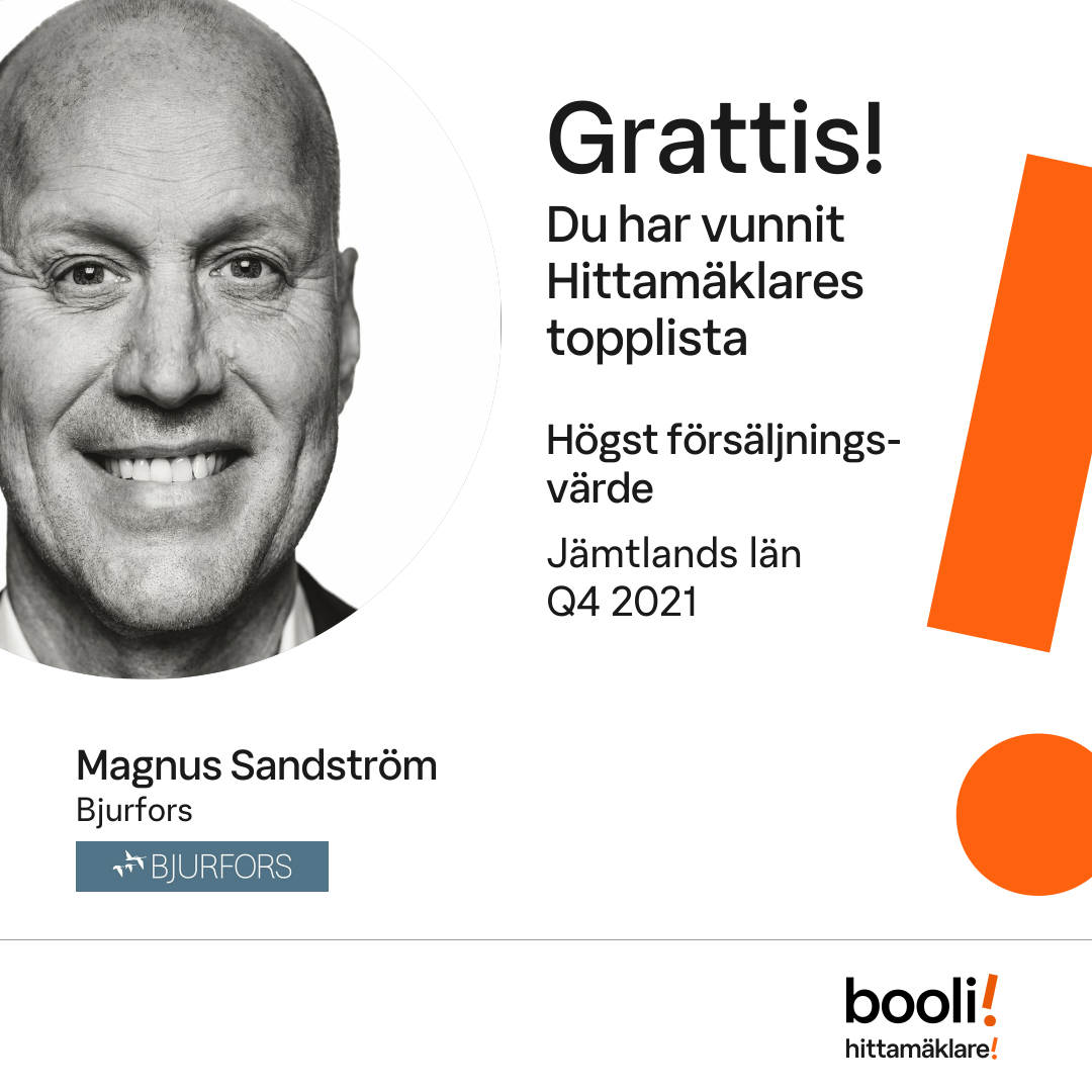 Statistik för publicerade bostäder, försäljningar och omdömen baseras på data från Booli och Hittamäklare. Statistiken för försäljningar avser inrapporterade och verifierade slutpriser från mäklare eller av Booli inhämtade och verifierade slutpriser. Statistiken för publicerade bostäder baseras på information som publicerats på Booli.se. Statistik för omdömen och rekommendationer baseras på omdömen från säljare som lämnats via Booli och Hittamäklare.