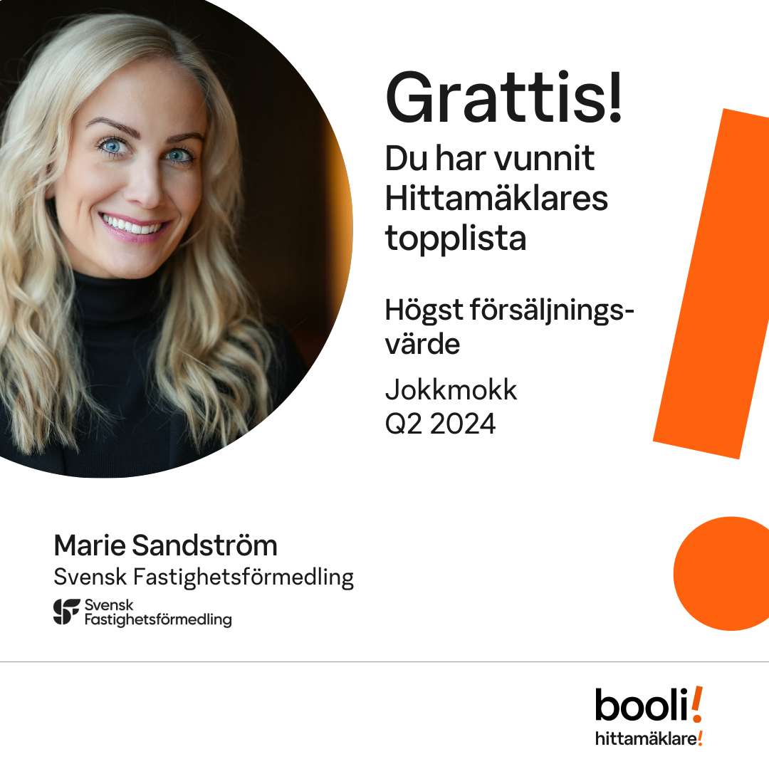 Statistik för publicerade bostäder, försäljningar och omdömen baseras på data från Booli och Hittamäklare. Statistiken för försäljningar avser inrapporterade och verifierade slutpriser från mäklare eller av Booli inhämtade och verifierade slutpriser. Statistiken för publicerade bostäder baseras på information som publicerats på Booli.se. Statistik för omdömen och rekommendationer baseras på omdömen från säljare som lämnats via Booli och Hittamäklare.