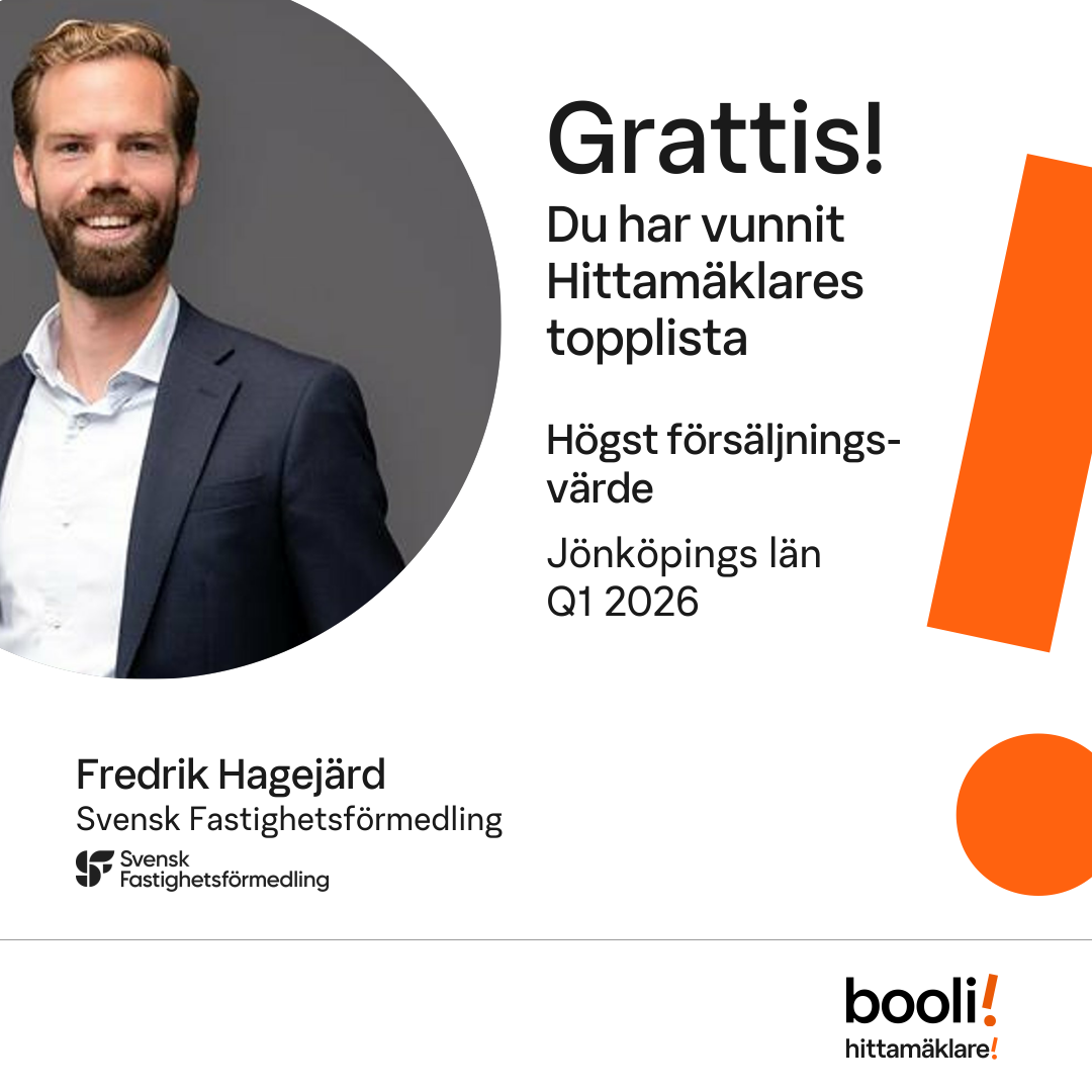 Statistik för publicerade bostäder, försäljningar och omdömen baseras på data från Booli. Statistiken för försäljningar avser inrapporterade och verifierade slutpriser från mäklare eller av Booli inhämtade och verifierade slutpriser. Statistiken för publicerade bostäder baseras på information som publicerats på Booli.se. Statistik för omdömen och rekommendationer baseras på omdömen från säljare som lämnats via Booli.