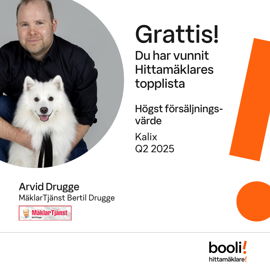 Statistik för publicerade bostäder, försäljningar och omdömen baseras på data från Booli och Hittamäklare. Statistiken för försäljningar avser inrapporterade och verifierade slutpriser från mäklare eller av Booli inhämtade och verifierade slutpriser. Statistiken för publicerade bostäder baseras på information som publicerats på Booli.se. Statistik för omdömen och rekommendationer baseras på omdömen från säljare som lämnats via Booli och Hittamäklare.