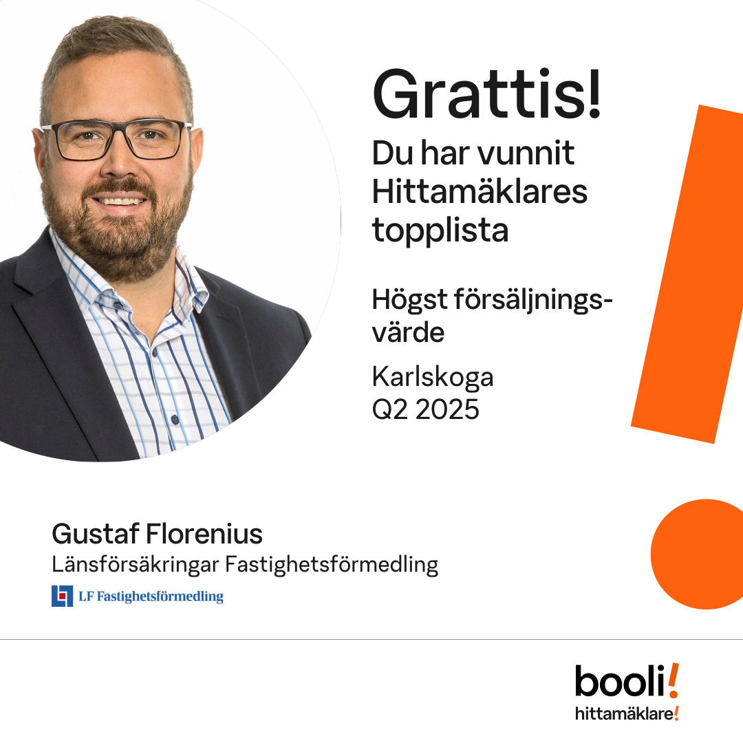 Statistik för publicerade bostäder, försäljningar och omdömen baseras på data från Booli och Hittamäklare. Statistiken för försäljningar avser inrapporterade och verifierade slutpriser från mäklare eller av Booli inhämtade och verifierade slutpriser. Statistiken för publicerade bostäder baseras på information som publicerats på Booli.se. Statistik för omdömen och rekommendationer baseras på omdömen från säljare som lämnats via Booli och Hittamäklare.