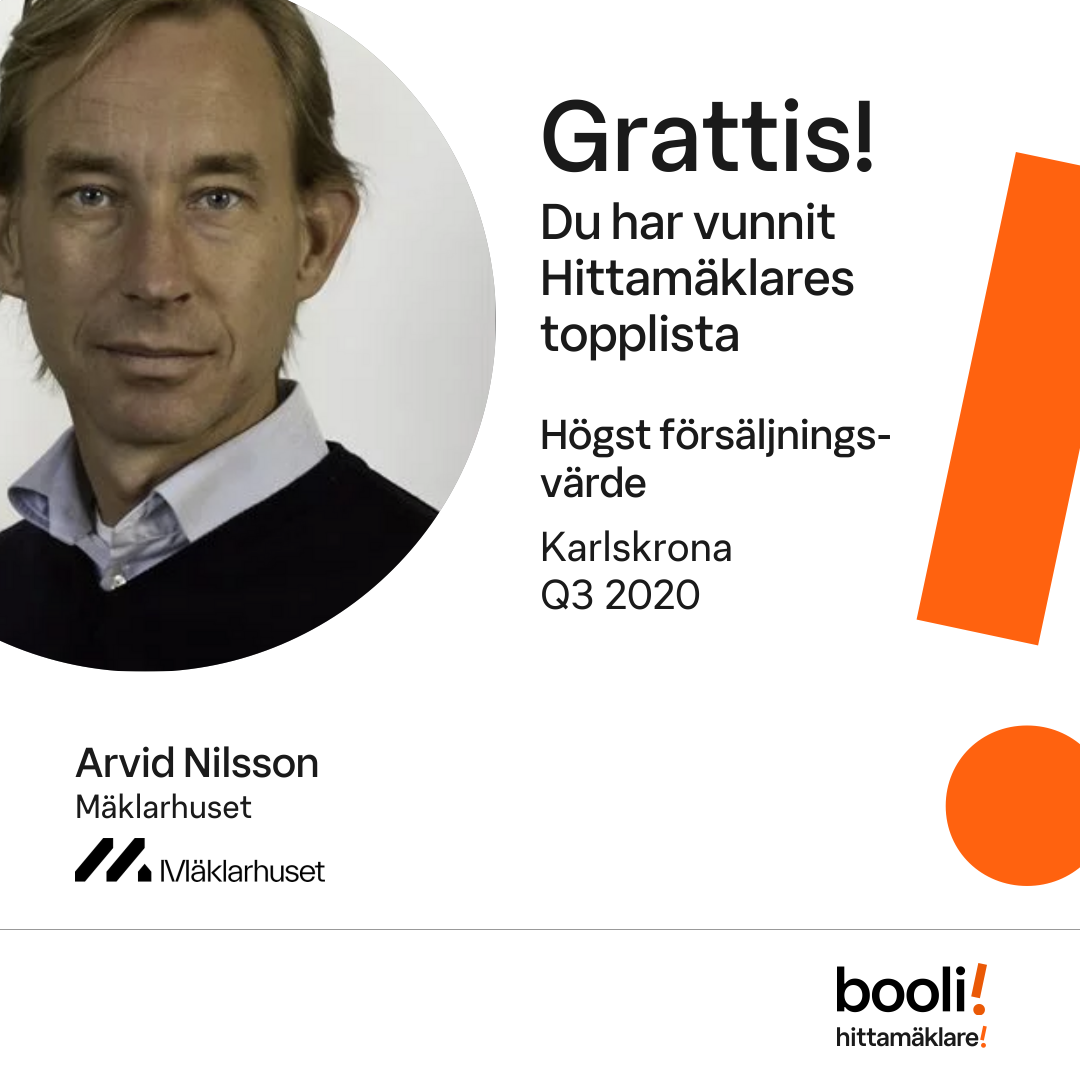 Statistik för publicerade bostäder, försäljningar och omdömen baseras på data från Booli och Hittamäklare. Statistiken för försäljningar avser inrapporterade och verifierade slutpriser från mäklare eller av Booli inhämtade och verifierade slutpriser. Statistiken för publicerade bostäder baseras på information som publicerats på Booli.se. Statistik för omdömen och rekommendationer baseras på omdömen från säljare som lämnats via Booli och Hittamäklare.