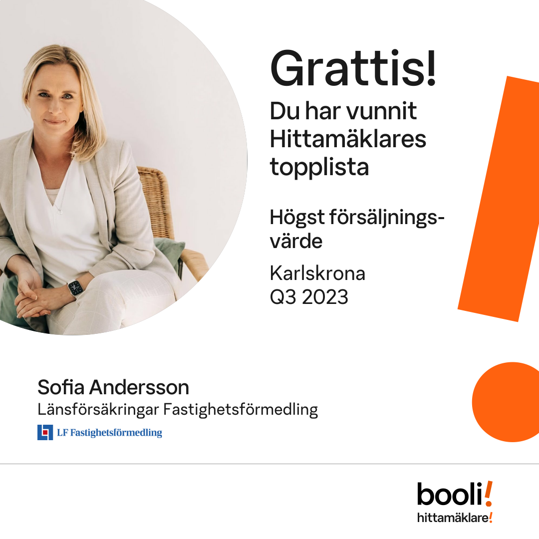 Statistik för publicerade bostäder, försäljningar och omdömen baseras på data från Booli och Hittamäklare. Statistiken för försäljningar avser inrapporterade och verifierade slutpriser från mäklare eller av Booli inhämtade och verifierade slutpriser. Statistiken för publicerade bostäder baseras på information som publicerats på Booli.se. Statistik för omdömen och rekommendationer baseras på omdömen från säljare som lämnats via Booli och Hittamäklare.