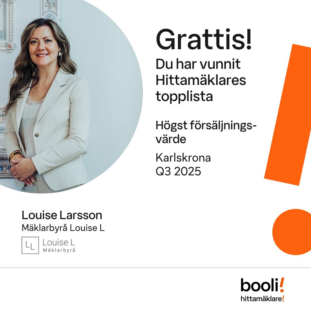 Statistik för publicerade bostäder, försäljningar och omdömen baseras på data från Booli och Hittamäklare. Statistiken för försäljningar avser inrapporterade och verifierade slutpriser från mäklare eller av Booli inhämtade och verifierade slutpriser. Statistiken för publicerade bostäder baseras på information som publicerats på Booli.se. Statistik för omdömen och rekommendationer baseras på omdömen från säljare som lämnats via Booli och Hittamäklare.