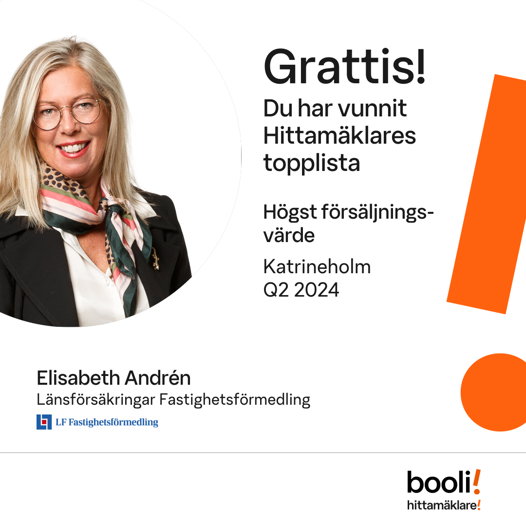 Statistik för publicerade bostäder, försäljningar och omdömen baseras på data från Booli och Hittamäklare. Statistiken för försäljningar avser inrapporterade och verifierade slutpriser från mäklare eller av Booli inhämtade och verifierade slutpriser. Statistiken för publicerade bostäder baseras på information som publicerats på Booli.se. Statistik för omdömen och rekommendationer baseras på omdömen från säljare som lämnats via Booli och Hittamäklare.