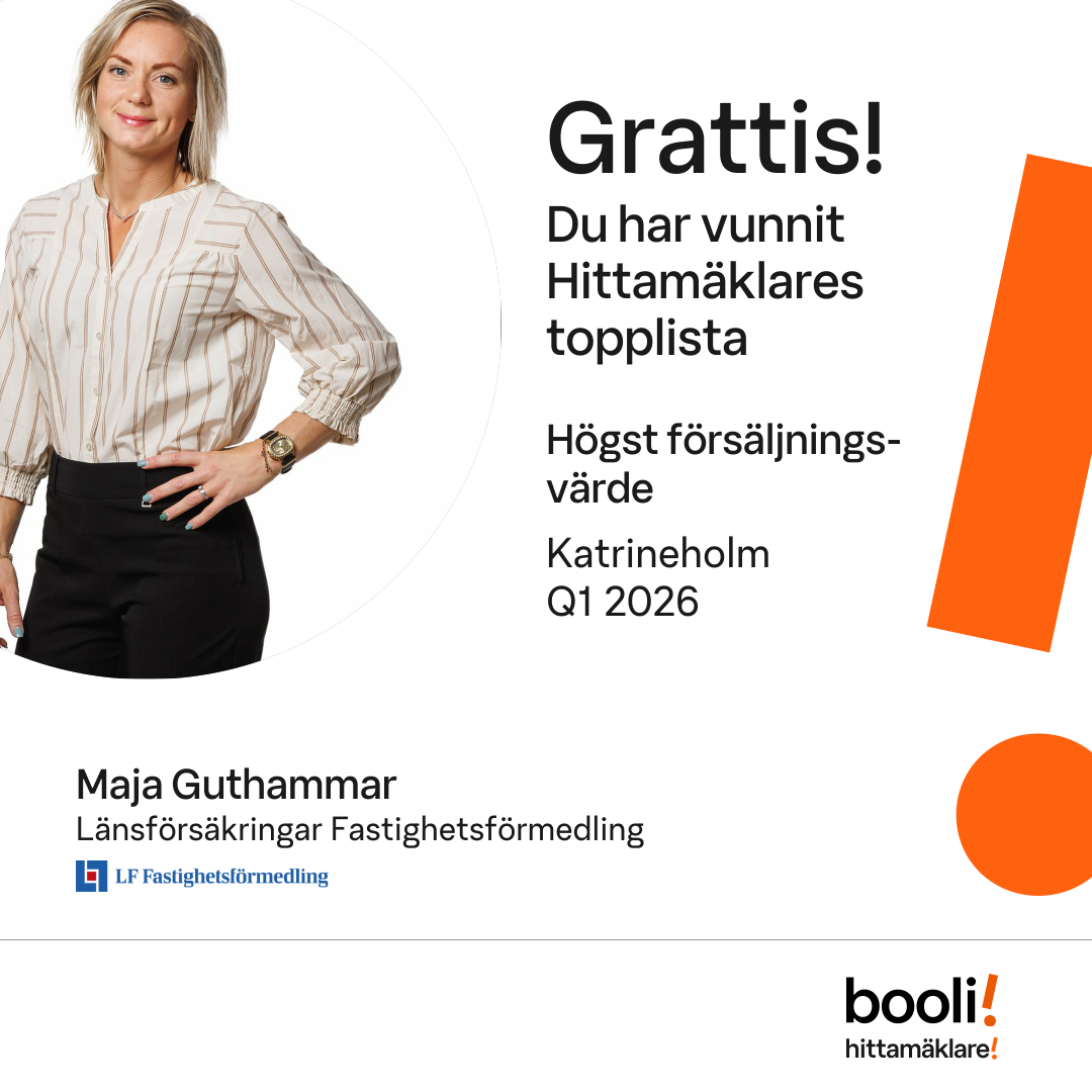 Statistik för publicerade bostäder, försäljningar och omdömen baseras på data från Booli. Statistiken för försäljningar avser inrapporterade och verifierade slutpriser från mäklare eller av Booli inhämtade och verifierade slutpriser. Statistiken för publicerade bostäder baseras på information som publicerats på Booli.se. Statistik för omdömen och rekommendationer baseras på omdömen från säljare som lämnats via Booli.