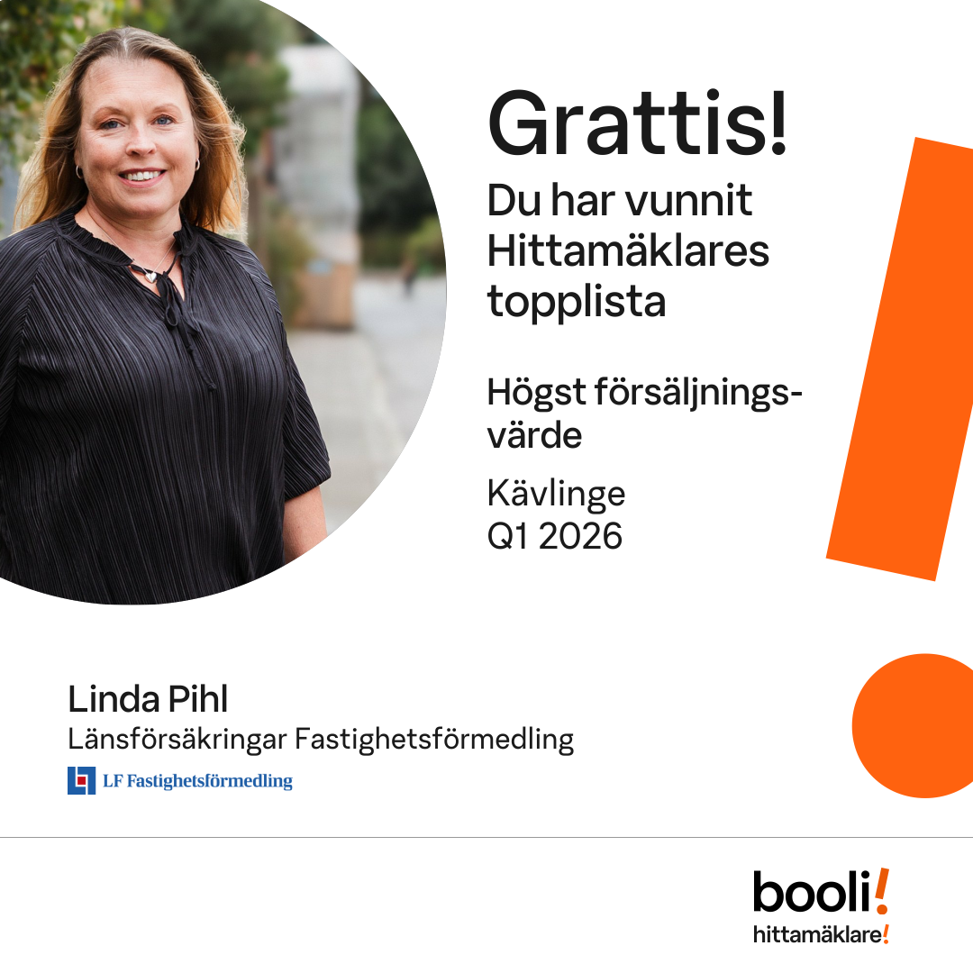 Statistik för publicerade bostäder, försäljningar och omdömen baseras på data från Booli. Statistiken för försäljningar avser inrapporterade och verifierade slutpriser från mäklare eller av Booli inhämtade och verifierade slutpriser. Statistiken för publicerade bostäder baseras på information som publicerats på Booli.se. Statistik för omdömen och rekommendationer baseras på omdömen från säljare som lämnats via Booli.