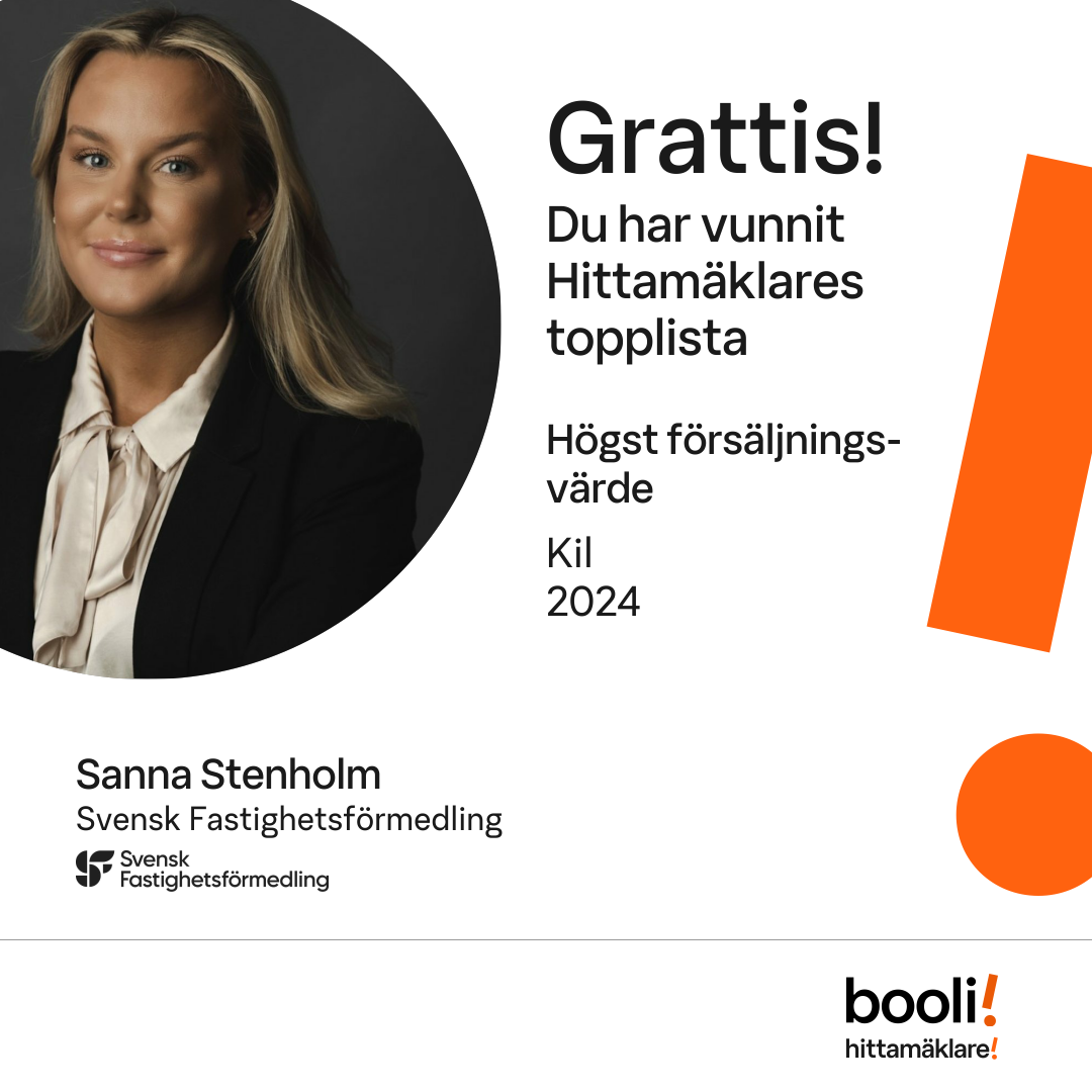 Statistik för publicerade bostäder, försäljningar och omdömen baseras på data från Booli och Hittamäklare. Statistiken för försäljningar avser inrapporterade och verifierade slutpriser från mäklare eller av Booli inhämtade och verifierade slutpriser. Statistiken för publicerade bostäder baseras på information som publicerats på Booli.se. Statistik för omdömen och rekommendationer baseras på omdömen från säljare som lämnats via Booli och Hittamäklare.
