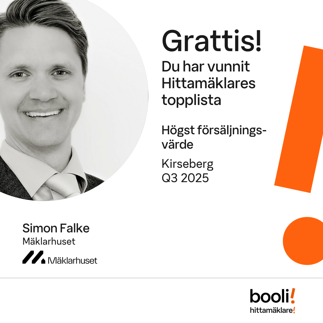 Statistik för publicerade bostäder, försäljningar och omdömen baseras på data från Booli och Hittamäklare. Statistiken för försäljningar avser inrapporterade och verifierade slutpriser från mäklare eller av Booli inhämtade och verifierade slutpriser. Statistiken för publicerade bostäder baseras på information som publicerats på Booli.se. Statistik för omdömen och rekommendationer baseras på omdömen från säljare som lämnats via Booli och Hittamäklare.
