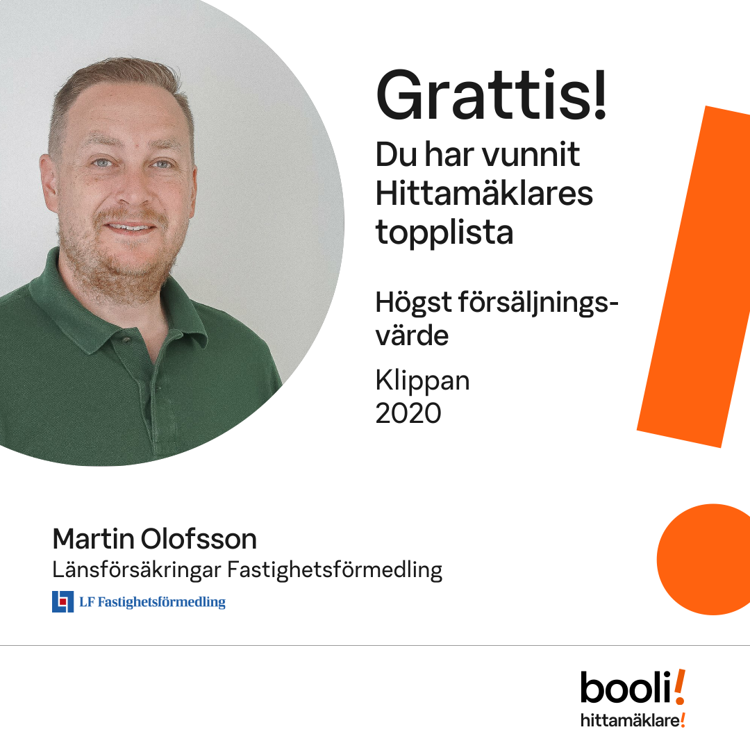 Statistik för publicerade bostäder, försäljningar och omdömen baseras på data från Booli och Hittamäklare. Statistiken för försäljningar avser inrapporterade och verifierade slutpriser från mäklare eller av Booli inhämtade och verifierade slutpriser. Statistiken för publicerade bostäder baseras på information som publicerats på Booli.se. Statistik för omdömen och rekommendationer baseras på omdömen från säljare som lämnats via Booli och Hittamäklare.