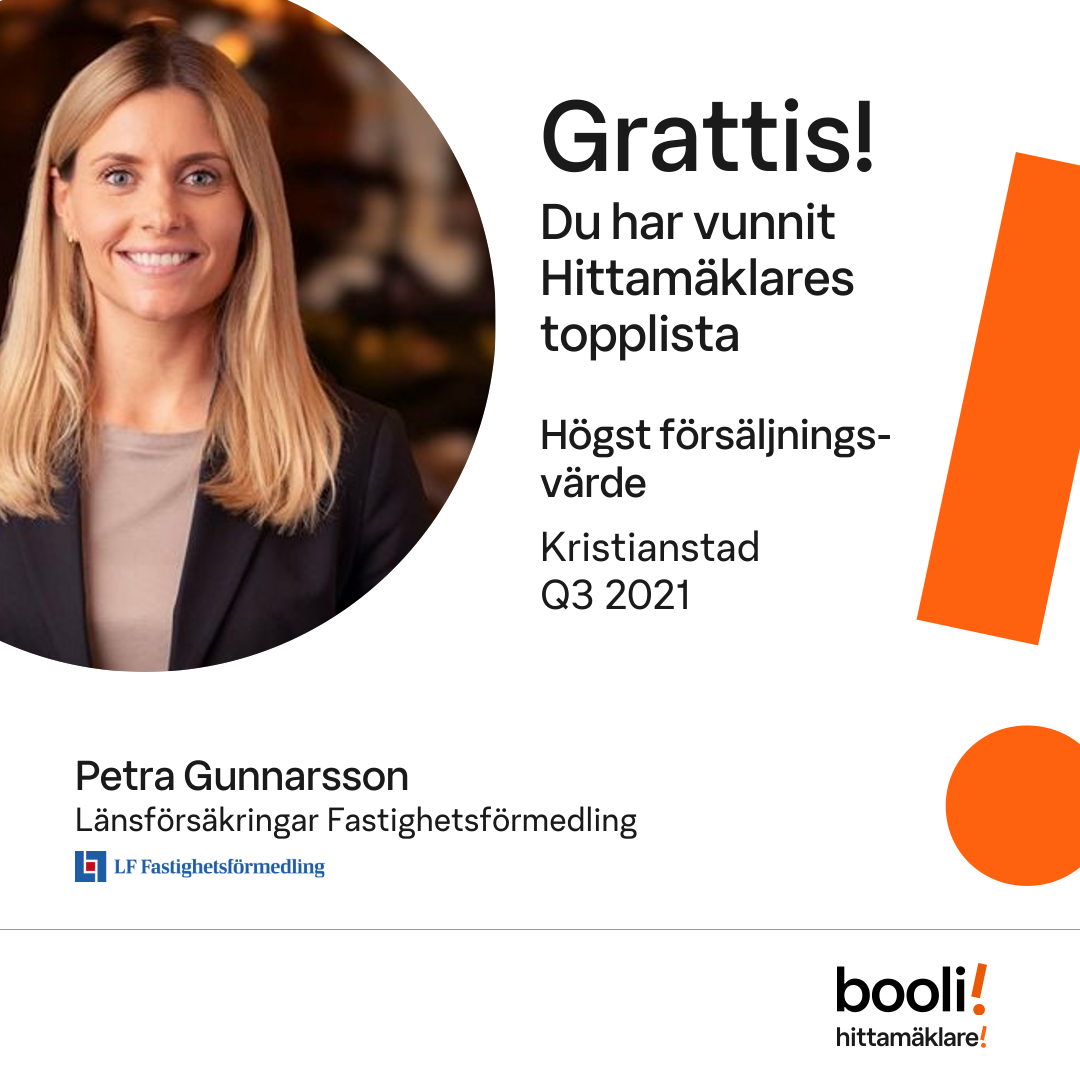 Statistik för publicerade bostäder, försäljningar och omdömen baseras på data från Booli och Hittamäklare. Statistiken för försäljningar avser inrapporterade och verifierade slutpriser från mäklare eller av Booli inhämtade och verifierade slutpriser. Statistiken för publicerade bostäder baseras på information som publicerats på Booli.se. Statistik för omdömen och rekommendationer baseras på omdömen från säljare som lämnats via Booli och Hittamäklare.