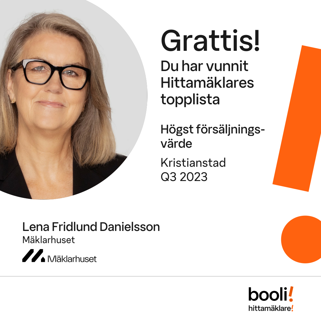 Statistik för publicerade bostäder, försäljningar och omdömen baseras på data från Booli och Hittamäklare. Statistiken för försäljningar avser inrapporterade och verifierade slutpriser från mäklare eller av Booli inhämtade och verifierade slutpriser. Statistiken för publicerade bostäder baseras på information som publicerats på Booli.se. Statistik för omdömen och rekommendationer baseras på omdömen från säljare som lämnats via Booli och Hittamäklare.