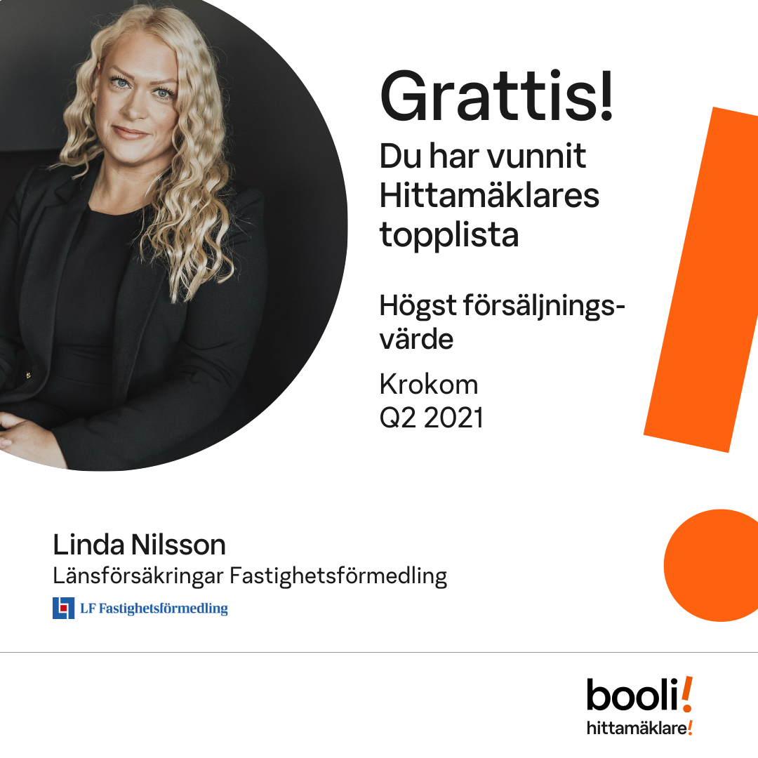 Statistik för publicerade bostäder, försäljningar och omdömen baseras på data från Booli och Hittamäklare. Statistiken för försäljningar avser inrapporterade och verifierade slutpriser från mäklare eller av Booli inhämtade och verifierade slutpriser. Statistiken för publicerade bostäder baseras på information som publicerats på Booli.se. Statistik för omdömen och rekommendationer baseras på omdömen från säljare som lämnats via Booli och Hittamäklare.