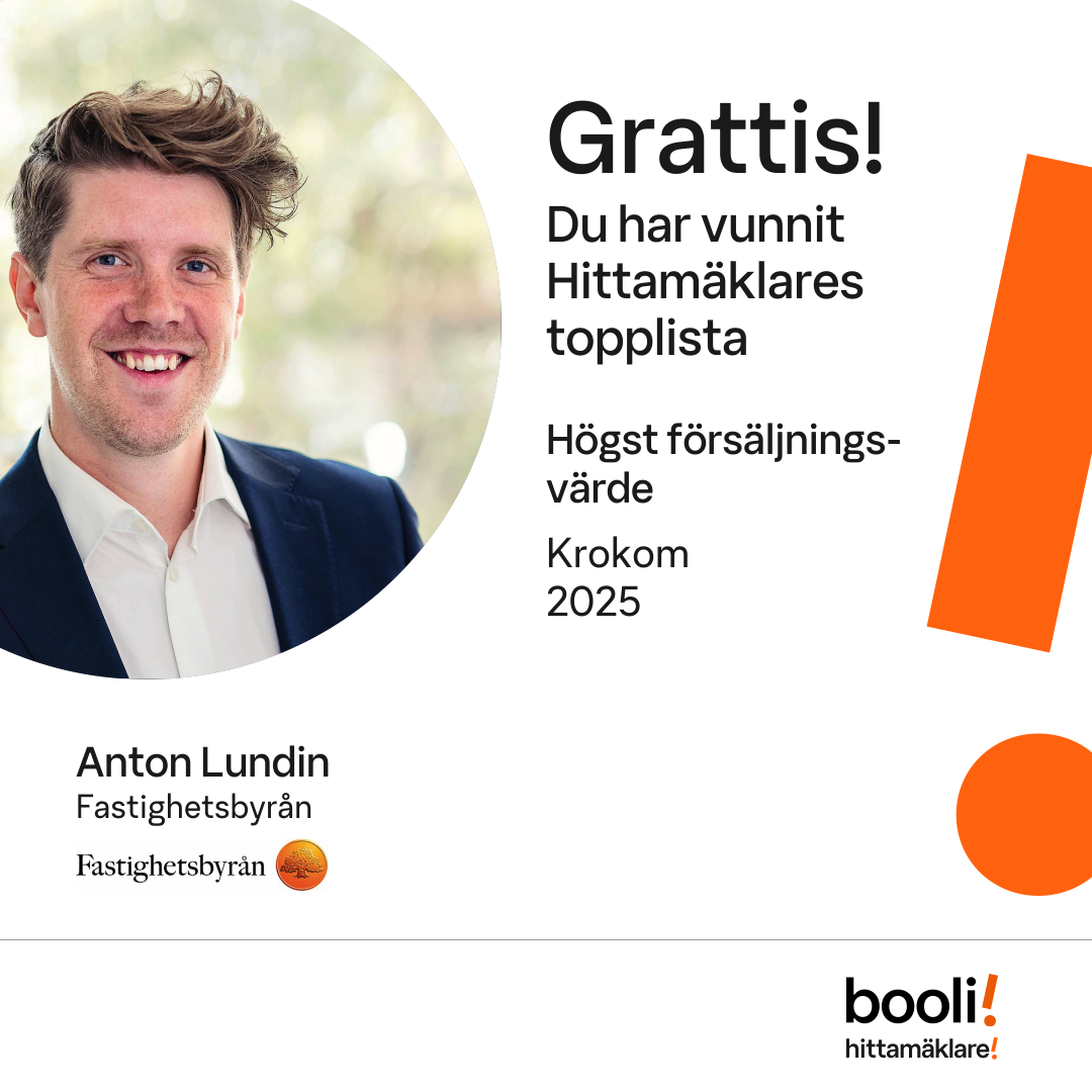 Statistik för publicerade bostäder, försäljningar och omdömen baseras på data från Booli och Hittamäklare. Statistiken för försäljningar avser inrapporterade och verifierade slutpriser från mäklare eller av Booli inhämtade och verifierade slutpriser. Statistiken för publicerade bostäder baseras på information som publicerats på Booli.se. Statistik för omdömen och rekommendationer baseras på omdömen från säljare som lämnats via Booli och Hittamäklare.