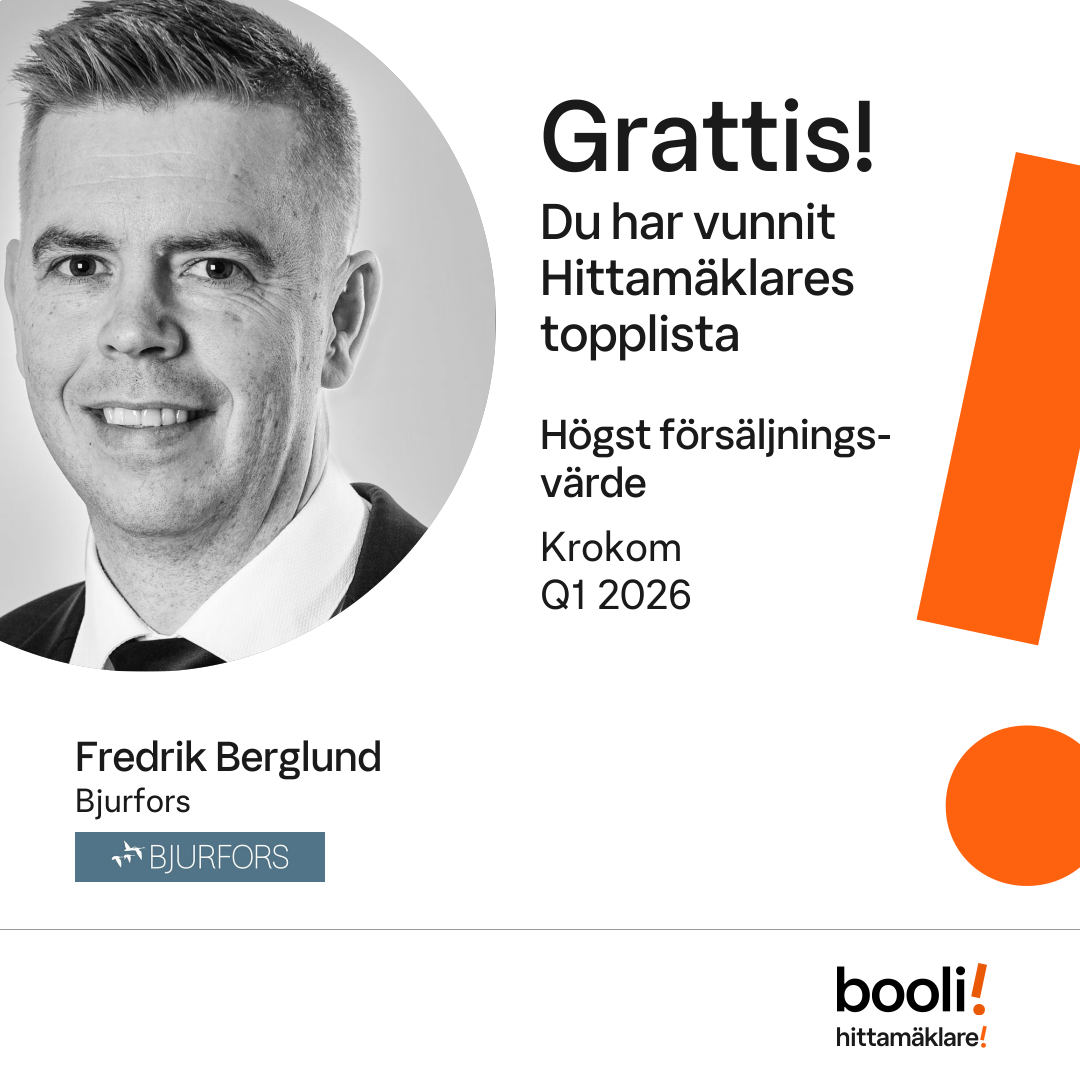 Statistik för publicerade bostäder, försäljningar och omdömen baseras på data från Booli. Statistiken för försäljningar avser inrapporterade och verifierade slutpriser från mäklare eller av Booli inhämtade och verifierade slutpriser. Statistiken för publicerade bostäder baseras på information som publicerats på Booli.se. Statistik för omdömen och rekommendationer baseras på omdömen från säljare som lämnats via Booli.