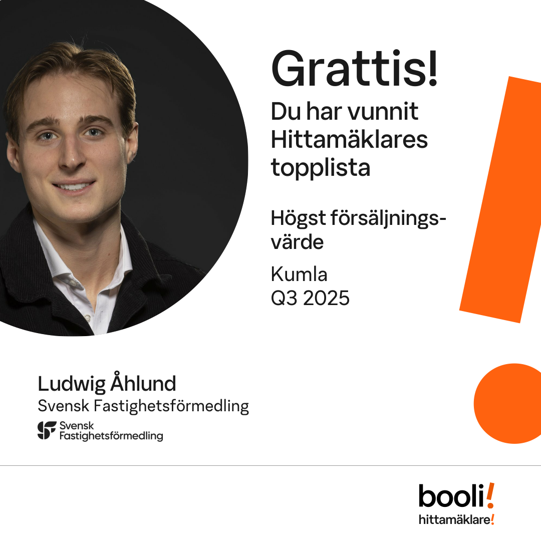 Statistik för publicerade bostäder, försäljningar och omdömen baseras på data från Booli och Hittamäklare. Statistiken för försäljningar avser inrapporterade och verifierade slutpriser från mäklare eller av Booli inhämtade och verifierade slutpriser. Statistiken för publicerade bostäder baseras på information som publicerats på Booli.se. Statistik för omdömen och rekommendationer baseras på omdömen från säljare som lämnats via Booli och Hittamäklare.