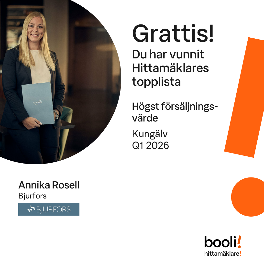 Statistik för publicerade bostäder, försäljningar och omdömen baseras på data från Booli. Statistiken för försäljningar avser inrapporterade och verifierade slutpriser från mäklare eller av Booli inhämtade och verifierade slutpriser. Statistiken för publicerade bostäder baseras på information som publicerats på Booli.se. Statistik för omdömen och rekommendationer baseras på omdömen från säljare som lämnats via Booli.