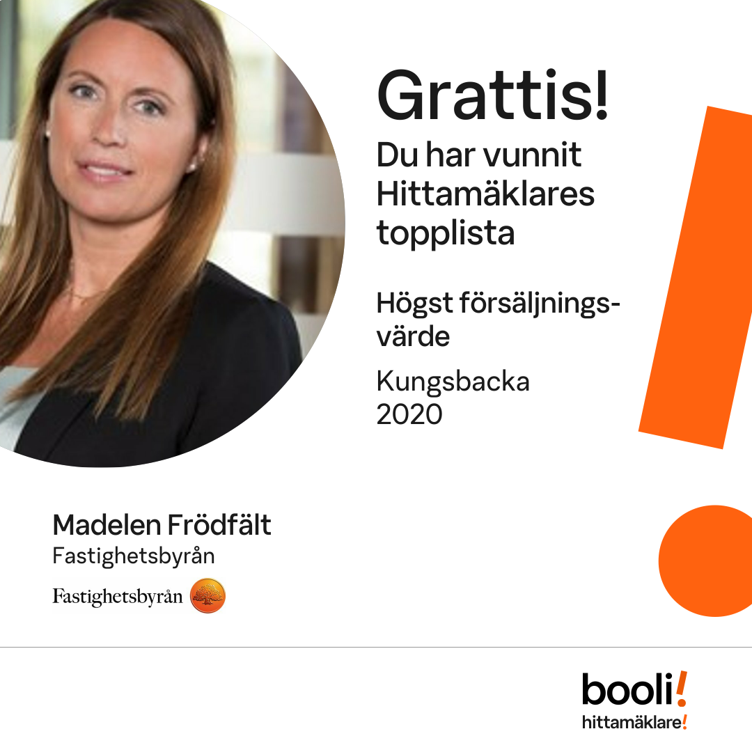 Statistik för publicerade bostäder, försäljningar och omdömen baseras på data från Booli och Hittamäklare. Statistiken för försäljningar avser inrapporterade och verifierade slutpriser från mäklare eller av Booli inhämtade och verifierade slutpriser. Statistiken för publicerade bostäder baseras på information som publicerats på Booli.se. Statistik för omdömen och rekommendationer baseras på omdömen från säljare som lämnats via Booli och Hittamäklare.