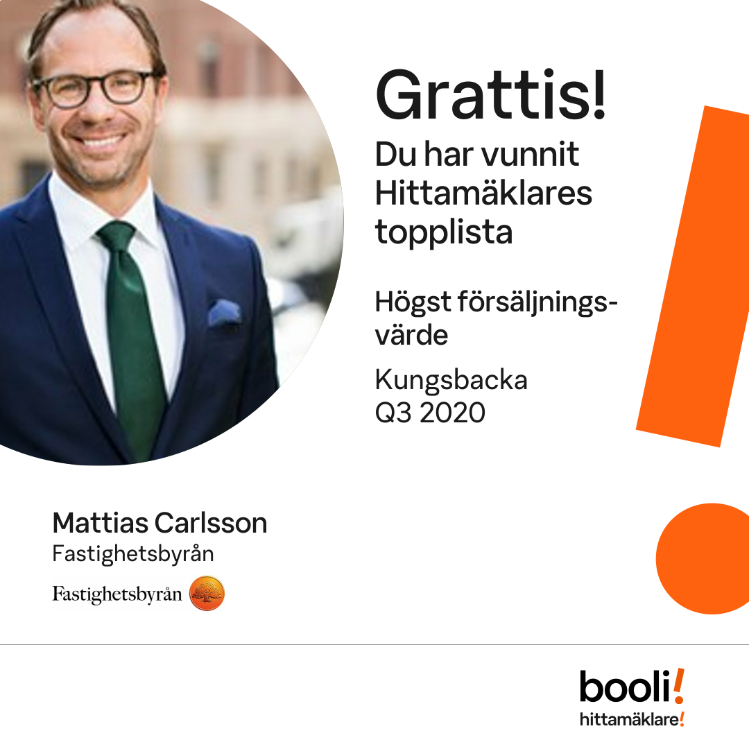 Statistik för publicerade bostäder, försäljningar och omdömen baseras på data från Booli och Hittamäklare. Statistiken för försäljningar avser inrapporterade och verifierade slutpriser från mäklare eller av Booli inhämtade och verifierade slutpriser. Statistiken för publicerade bostäder baseras på information som publicerats på Booli.se. Statistik för omdömen och rekommendationer baseras på omdömen från säljare som lämnats via Booli och Hittamäklare.