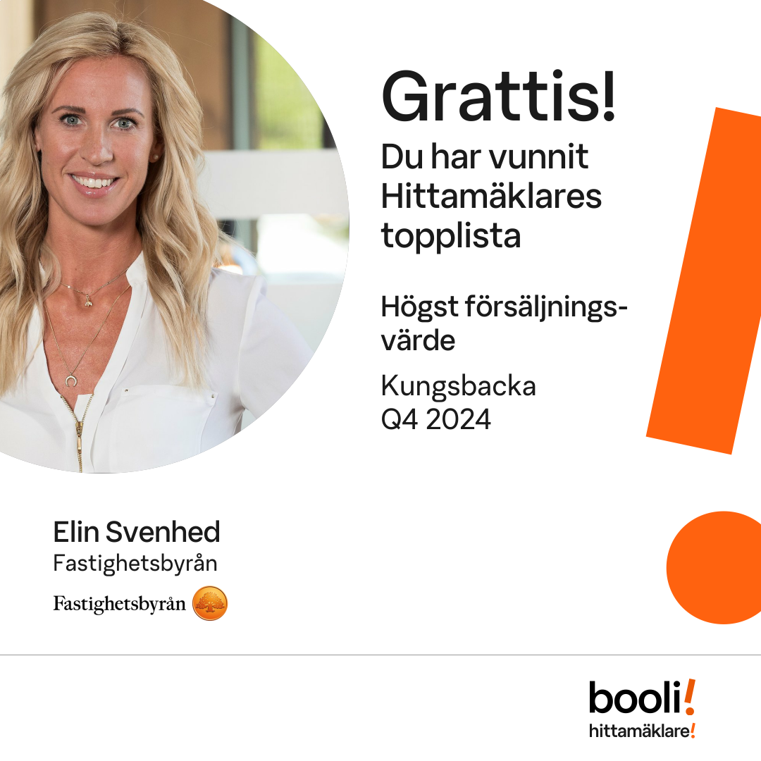 Statistik för publicerade bostäder, försäljningar och omdömen baseras på data från Booli och Hittamäklare. Statistiken för försäljningar avser inrapporterade och verifierade slutpriser från mäklare eller av Booli inhämtade och verifierade slutpriser. Statistiken för publicerade bostäder baseras på information som publicerats på Booli.se. Statistik för omdömen och rekommendationer baseras på omdömen från säljare som lämnats via Booli och Hittamäklare.