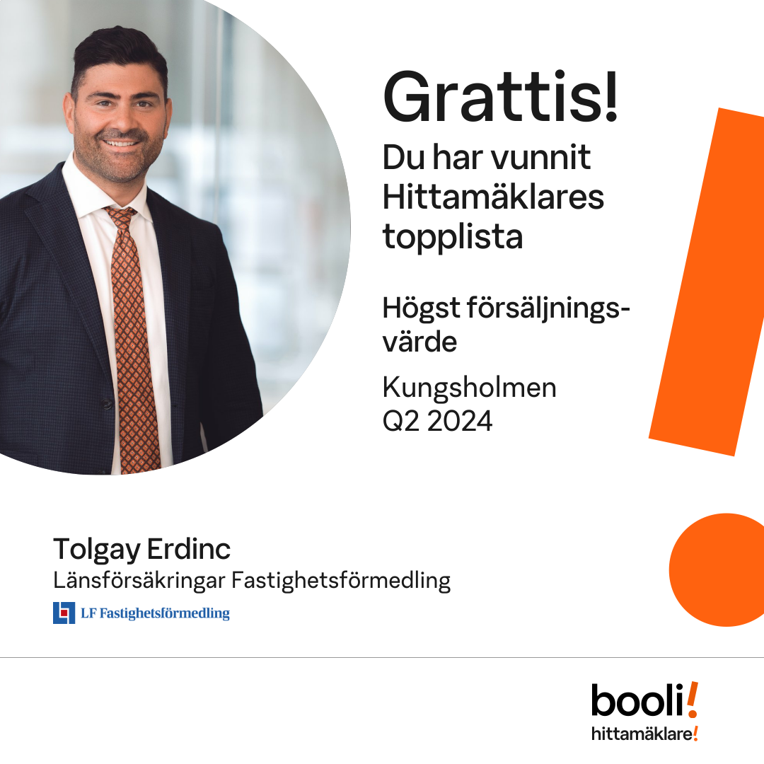 Statistik för publicerade bostäder, försäljningar och omdömen baseras på data från Booli och Hittamäklare. Statistiken för försäljningar avser inrapporterade och verifierade slutpriser från mäklare eller av Booli inhämtade och verifierade slutpriser. Statistiken för publicerade bostäder baseras på information som publicerats på Booli.se. Statistik för omdömen och rekommendationer baseras på omdömen från säljare som lämnats via Booli och Hittamäklare.