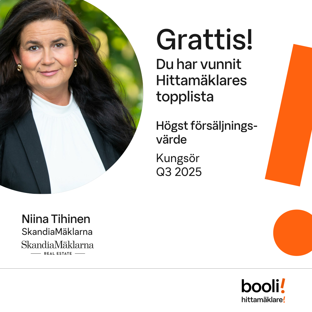 Statistik för publicerade bostäder, försäljningar och omdömen baseras på data från Booli och Hittamäklare. Statistiken för försäljningar avser inrapporterade och verifierade slutpriser från mäklare eller av Booli inhämtade och verifierade slutpriser. Statistiken för publicerade bostäder baseras på information som publicerats på Booli.se. Statistik för omdömen och rekommendationer baseras på omdömen från säljare som lämnats via Booli och Hittamäklare.