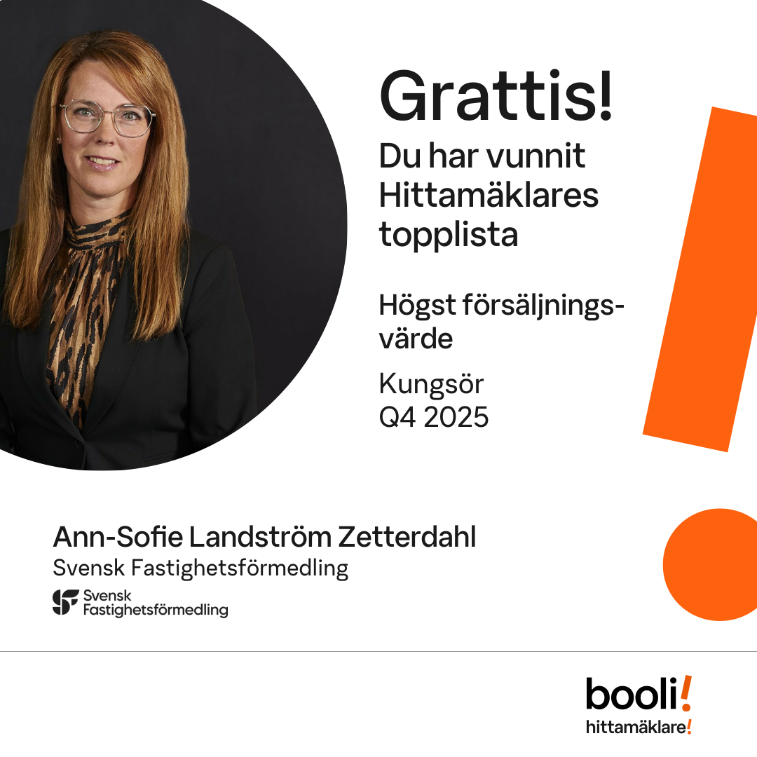 Statistik för publicerade bostäder, försäljningar och omdömen baseras på data från Booli och Hittamäklare. Statistiken för försäljningar avser inrapporterade och verifierade slutpriser från mäklare eller av Booli inhämtade och verifierade slutpriser. Statistiken för publicerade bostäder baseras på information som publicerats på Booli.se. Statistik för omdömen och rekommendationer baseras på omdömen från säljare som lämnats via Booli och Hittamäklare.