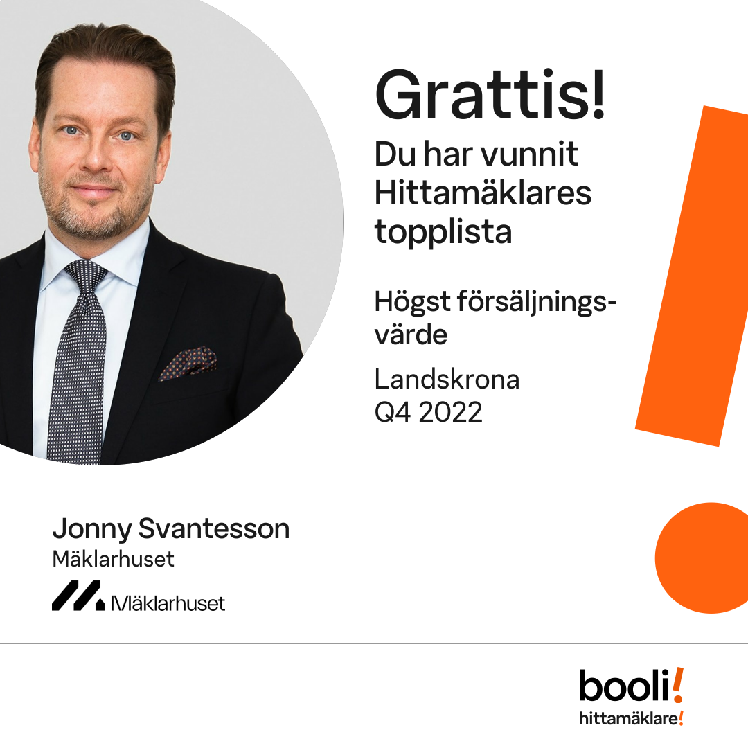 Statistik för publicerade bostäder, försäljningar och omdömen baseras på data från Booli och Hittamäklare. Statistiken för försäljningar avser inrapporterade och verifierade slutpriser från mäklare eller av Booli inhämtade och verifierade slutpriser. Statistiken för publicerade bostäder baseras på information som publicerats på Booli.se. Statistik för omdömen och rekommendationer baseras på omdömen från säljare som lämnats via Booli och Hittamäklare.