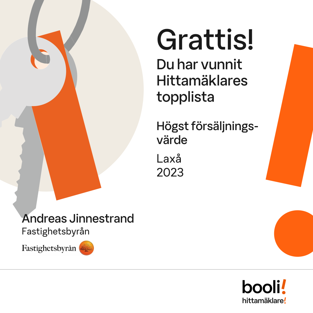 Statistik för publicerade bostäder, försäljningar och omdömen baseras på data från Booli och Hittamäklare. Statistiken för försäljningar avser inrapporterade och verifierade slutpriser från mäklare eller av Booli inhämtade och verifierade slutpriser. Statistiken för publicerade bostäder baseras på information som publicerats på Booli.se. Statistik för omdömen och rekommendationer baseras på omdömen från säljare som lämnats via Booli och Hittamäklare.