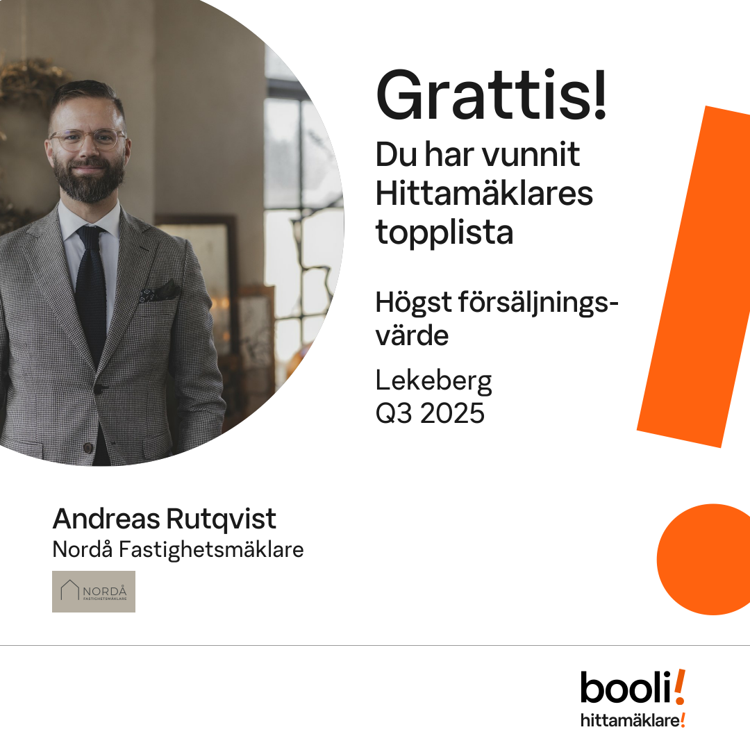 Statistik för publicerade bostäder, försäljningar och omdömen baseras på data från Booli och Hittamäklare. Statistiken för försäljningar avser inrapporterade och verifierade slutpriser från mäklare eller av Booli inhämtade och verifierade slutpriser. Statistiken för publicerade bostäder baseras på information som publicerats på Booli.se. Statistik för omdömen och rekommendationer baseras på omdömen från säljare som lämnats via Booli och Hittamäklare.