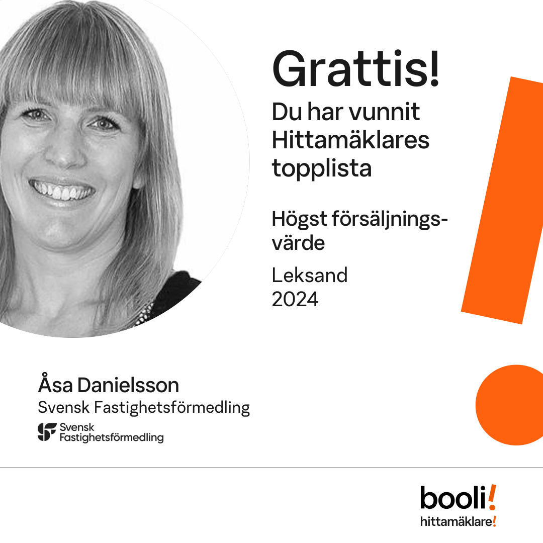 Statistik för publicerade bostäder, försäljningar och omdömen baseras på data från Booli och Hittamäklare. Statistiken för försäljningar avser inrapporterade och verifierade slutpriser från mäklare eller av Booli inhämtade och verifierade slutpriser. Statistiken för publicerade bostäder baseras på information som publicerats på Booli.se. Statistik för omdömen och rekommendationer baseras på omdömen från säljare som lämnats via Booli och Hittamäklare.