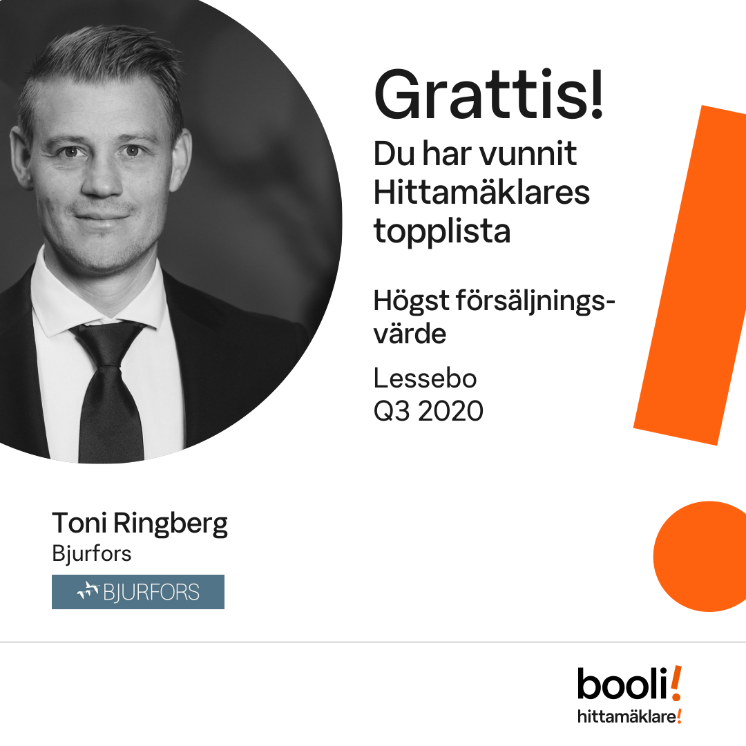 Statistik för publicerade bostäder, försäljningar och omdömen baseras på data från Booli och Hittamäklare. Statistiken för försäljningar avser inrapporterade och verifierade slutpriser från mäklare eller av Booli inhämtade och verifierade slutpriser. Statistiken för publicerade bostäder baseras på information som publicerats på Booli.se. Statistik för omdömen och rekommendationer baseras på omdömen från säljare som lämnats via Booli och Hittamäklare.
