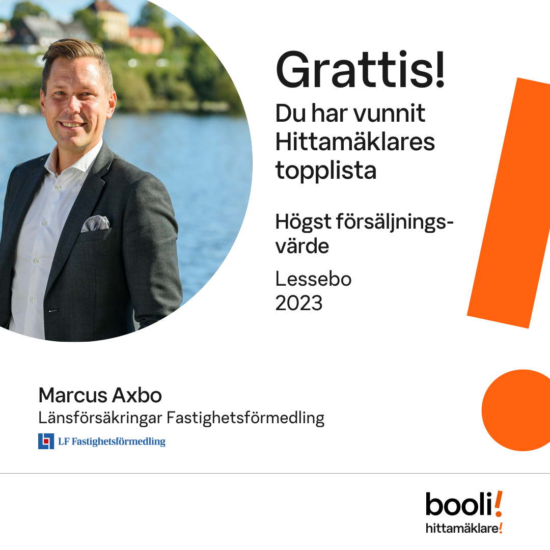 Statistik för publicerade bostäder, försäljningar och omdömen baseras på data från Booli och Hittamäklare. Statistiken för försäljningar avser inrapporterade och verifierade slutpriser från mäklare eller av Booli inhämtade och verifierade slutpriser. Statistiken för publicerade bostäder baseras på information som publicerats på Booli.se. Statistik för omdömen och rekommendationer baseras på omdömen från säljare som lämnats via Booli och Hittamäklare.