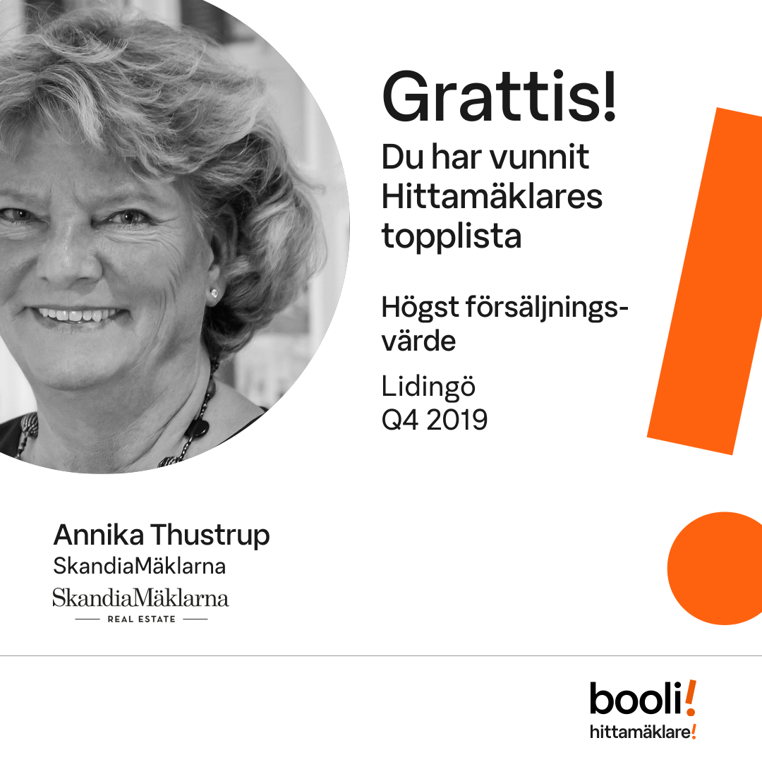 Statistik för publicerade bostäder, försäljningar och omdömen baseras på data från Booli och Hittamäklare. Statistiken för försäljningar avser inrapporterade och verifierade slutpriser från mäklare eller av Booli inhämtade och verifierade slutpriser. Statistiken för publicerade bostäder baseras på information som publicerats på Booli.se. Statistik för omdömen och rekommendationer baseras på omdömen från säljare som lämnats via Booli och Hittamäklare.