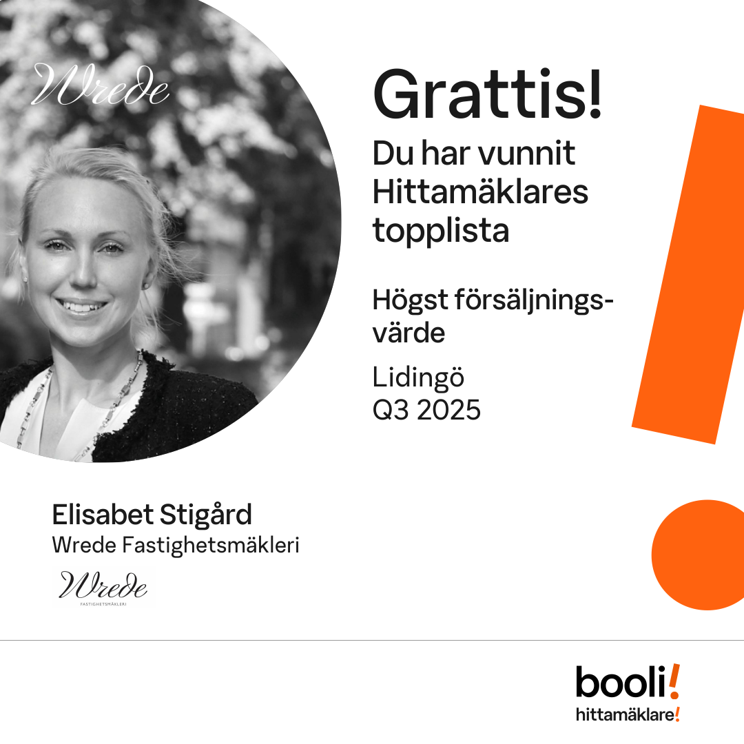 Statistik för publicerade bostäder, försäljningar och omdömen baseras på data från Booli och Hittamäklare. Statistiken för försäljningar avser inrapporterade och verifierade slutpriser från mäklare eller av Booli inhämtade och verifierade slutpriser. Statistiken för publicerade bostäder baseras på information som publicerats på Booli.se. Statistik för omdömen och rekommendationer baseras på omdömen från säljare som lämnats via Booli och Hittamäklare.