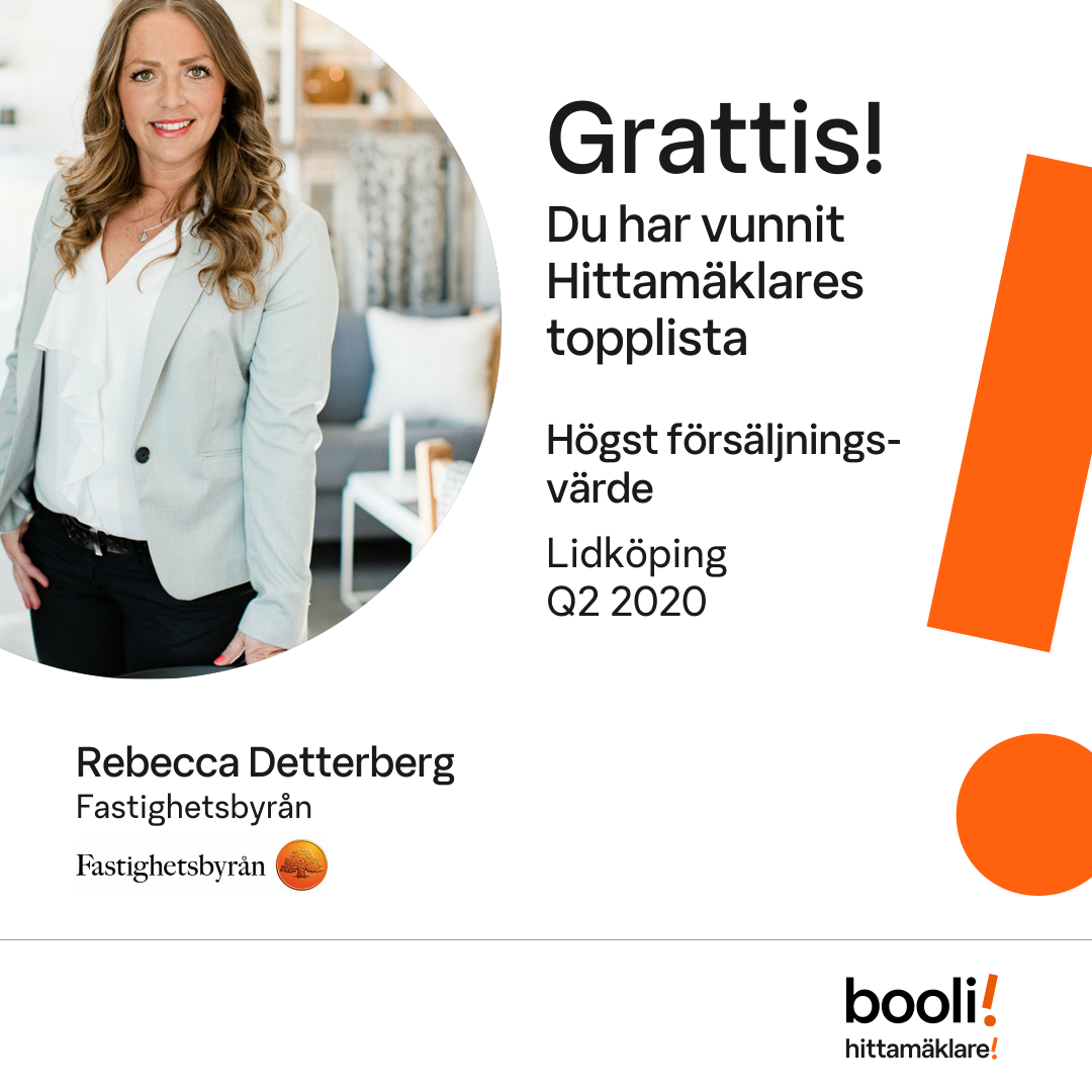 Statistik för publicerade bostäder, försäljningar och omdömen baseras på data från Booli och Hittamäklare. Statistiken för försäljningar avser inrapporterade och verifierade slutpriser från mäklare eller av Booli inhämtade och verifierade slutpriser. Statistiken för publicerade bostäder baseras på information som publicerats på Booli.se. Statistik för omdömen och rekommendationer baseras på omdömen från säljare som lämnats via Booli och Hittamäklare.