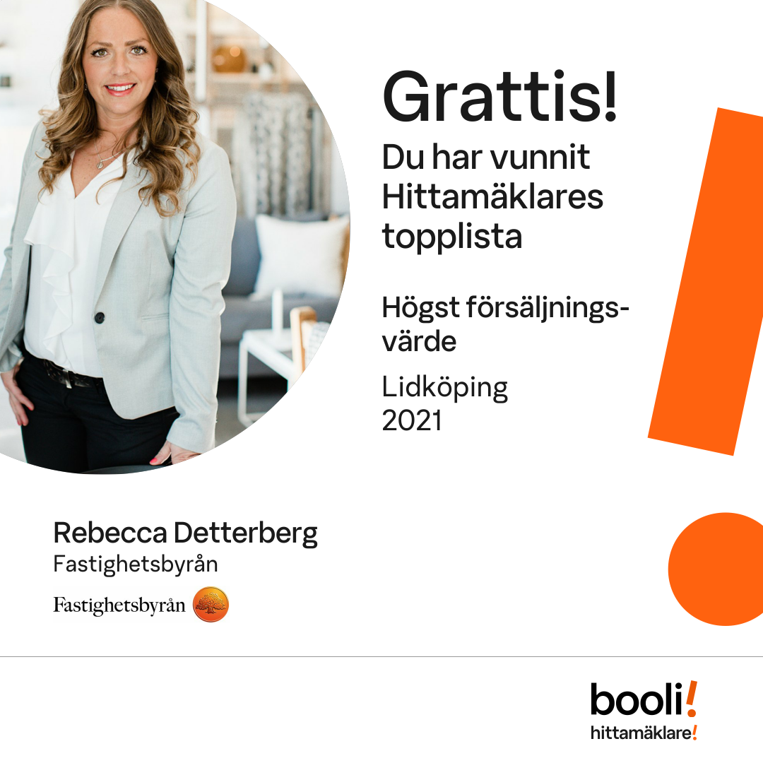 Statistik för publicerade bostäder, försäljningar och omdömen baseras på data från Booli och Hittamäklare. Statistiken för försäljningar avser inrapporterade och verifierade slutpriser från mäklare eller av Booli inhämtade och verifierade slutpriser. Statistiken för publicerade bostäder baseras på information som publicerats på Booli.se. Statistik för omdömen och rekommendationer baseras på omdömen från säljare som lämnats via Booli och Hittamäklare.