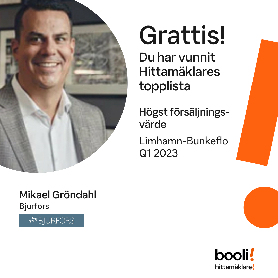 Statistik för publicerade bostäder, försäljningar och omdömen baseras på data från Booli och Hittamäklare. Statistiken för försäljningar avser inrapporterade och verifierade slutpriser från mäklare eller av Booli inhämtade och verifierade slutpriser. Statistiken för publicerade bostäder baseras på information som publicerats på Booli.se. Statistik för omdömen och rekommendationer baseras på omdömen från säljare som lämnats via Booli och Hittamäklare.