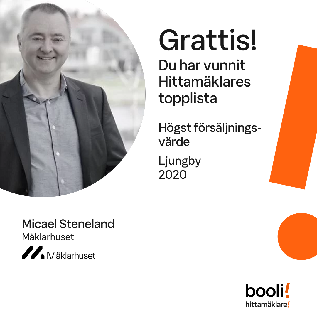Statistik för publicerade bostäder, försäljningar och omdömen baseras på data från Booli och Hittamäklare. Statistiken för försäljningar avser inrapporterade och verifierade slutpriser från mäklare eller av Booli inhämtade och verifierade slutpriser. Statistiken för publicerade bostäder baseras på information som publicerats på Booli.se. Statistik för omdömen och rekommendationer baseras på omdömen från säljare som lämnats via Booli och Hittamäklare.