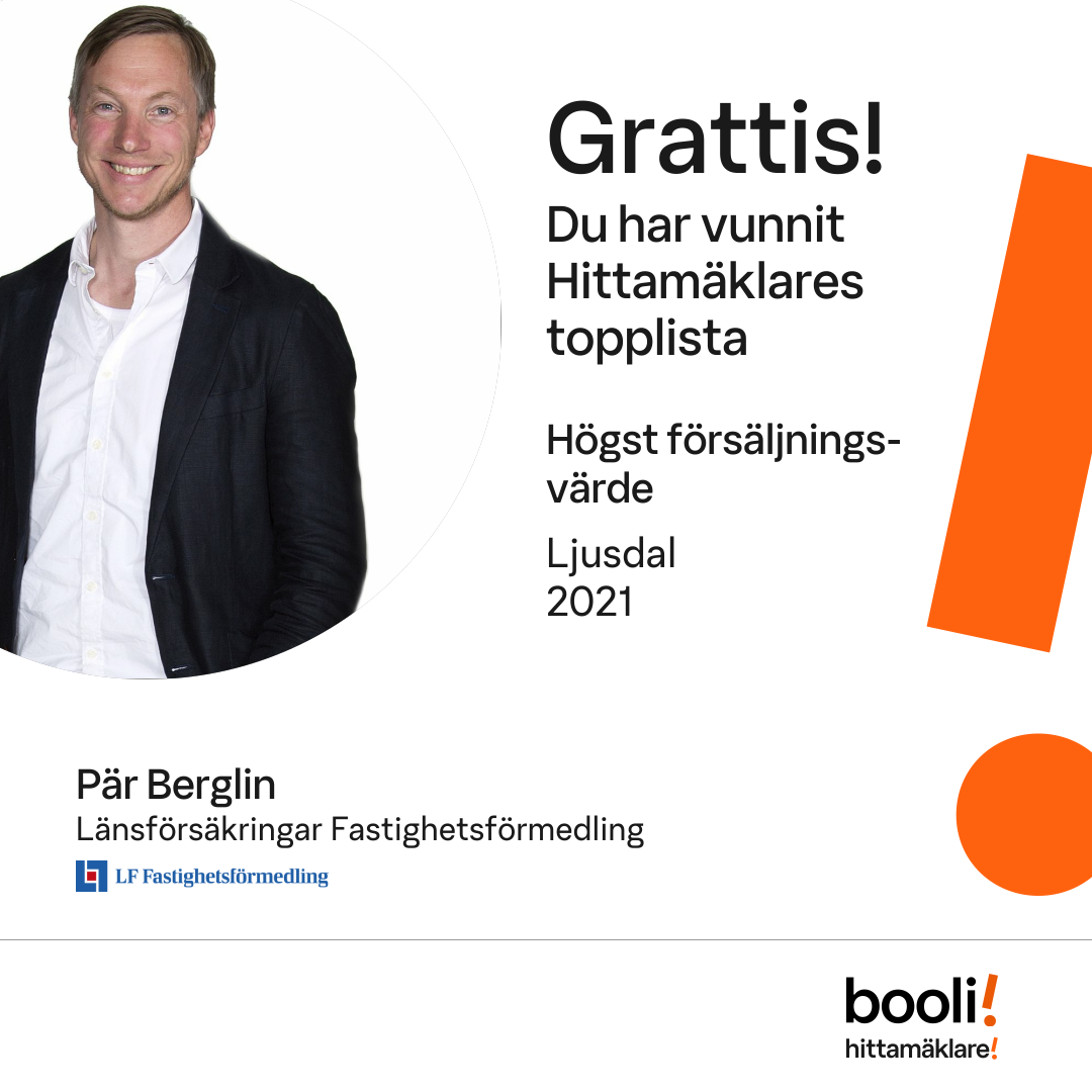 Statistik för publicerade bostäder, försäljningar och omdömen baseras på data från Booli och Hittamäklare. Statistiken för försäljningar avser inrapporterade och verifierade slutpriser från mäklare eller av Booli inhämtade och verifierade slutpriser. Statistiken för publicerade bostäder baseras på information som publicerats på Booli.se. Statistik för omdömen och rekommendationer baseras på omdömen från säljare som lämnats via Booli och Hittamäklare.